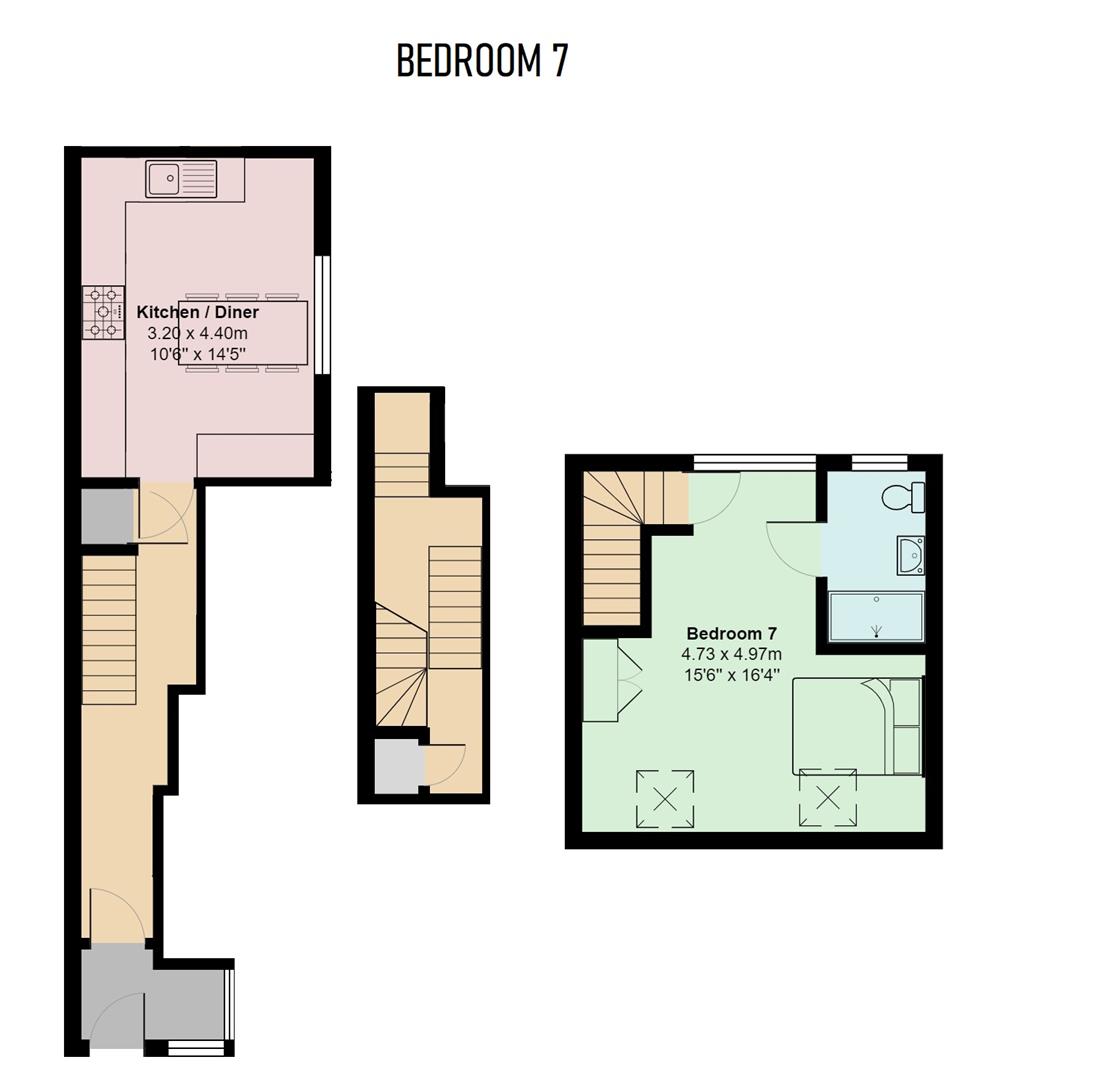 Room 7 is the attic bedroom and the largest room in the house with excellent storage, double bed with mattress, fitted wardrobe, chest of drawers, desk with chair and ensuite shower room.