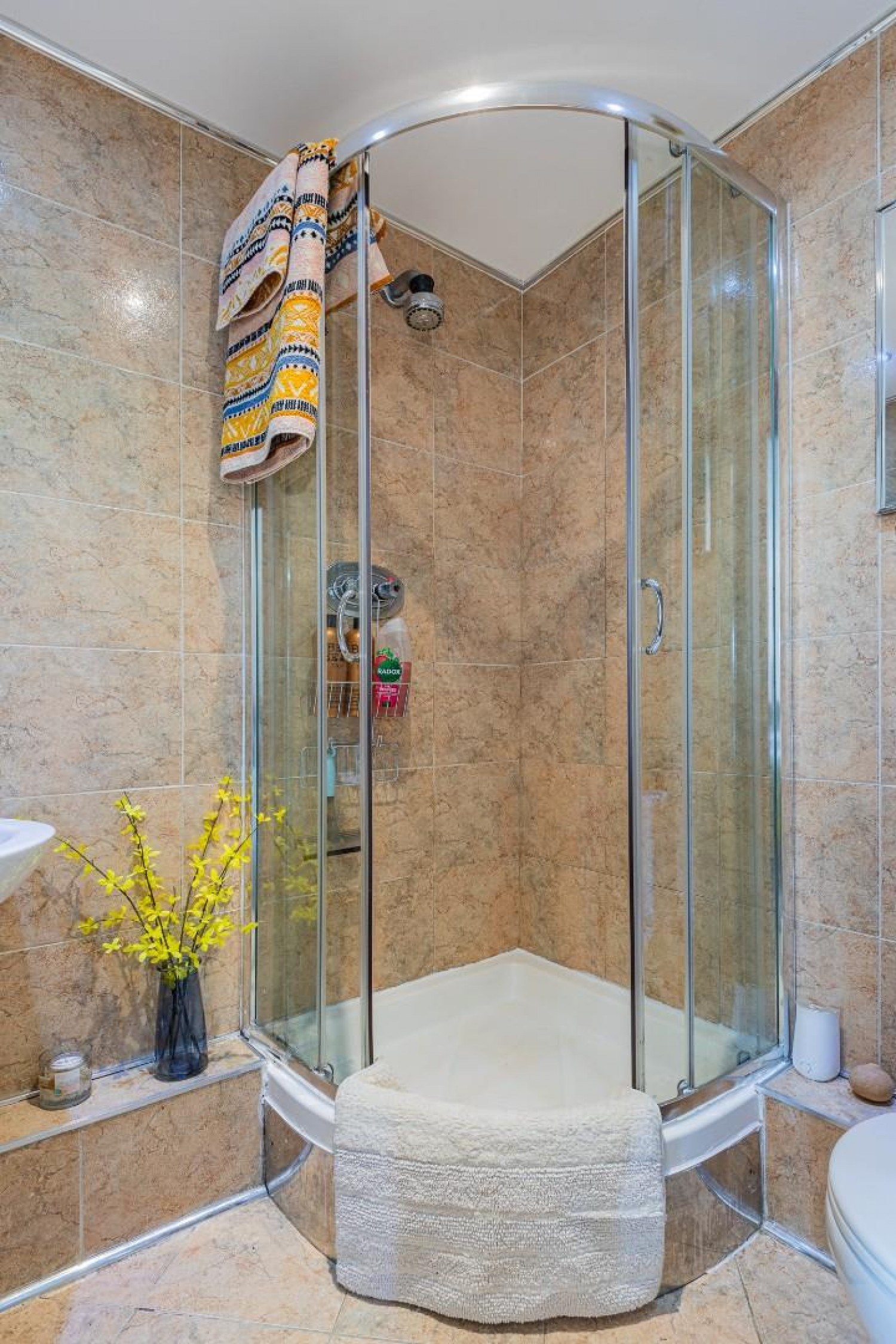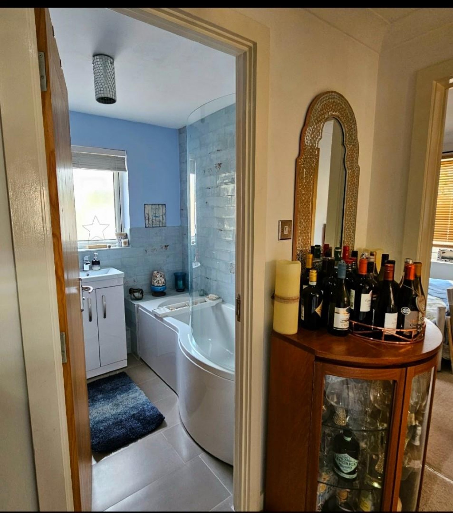 Refitted and stylishly appointed with a corner shower cubicle, corner pedestal wash hand basin and close coupled wc, fully tiled and tiled floor, extractor fan.