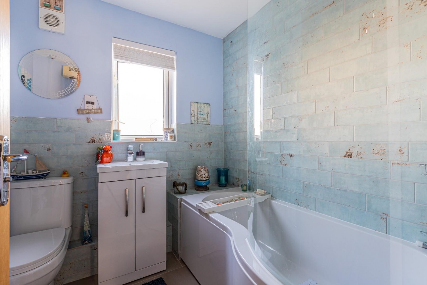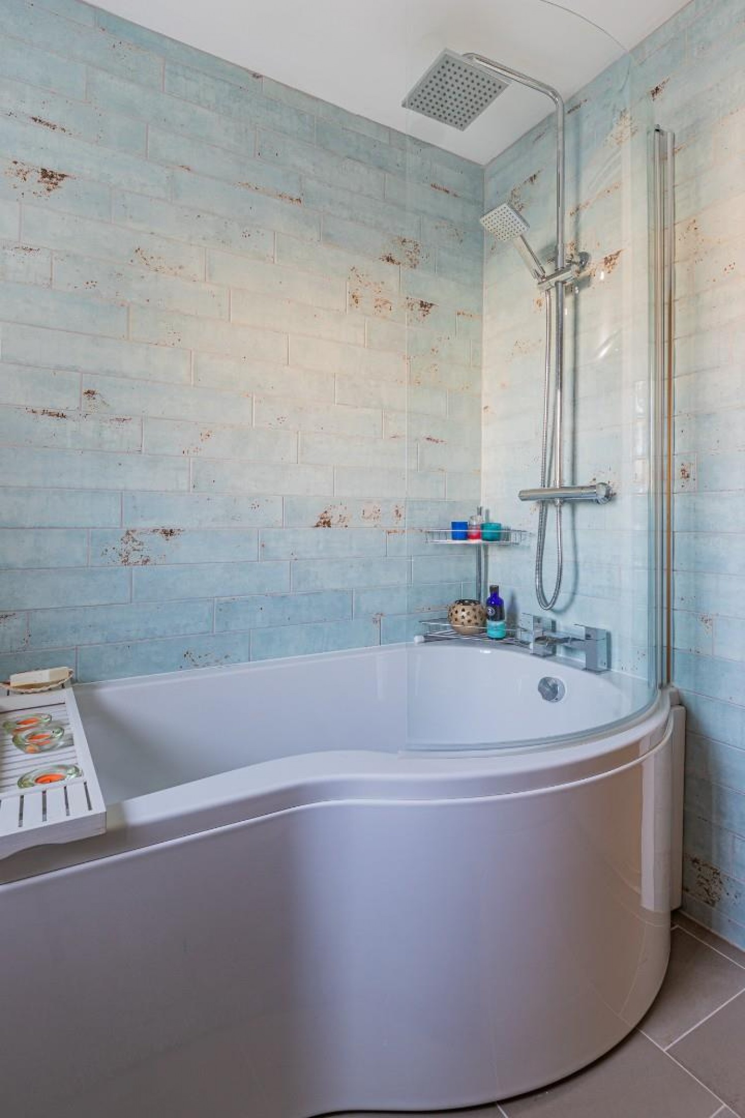Refitted modern white suite comprising a panel P shape bath with over head shower plus shower attachment and glass screen, vanity wash hand basin - waterfall tap to the both and a close coupled wc, porcelain tiled floor, heated chrome towel rail, twin shaver point, window to front.