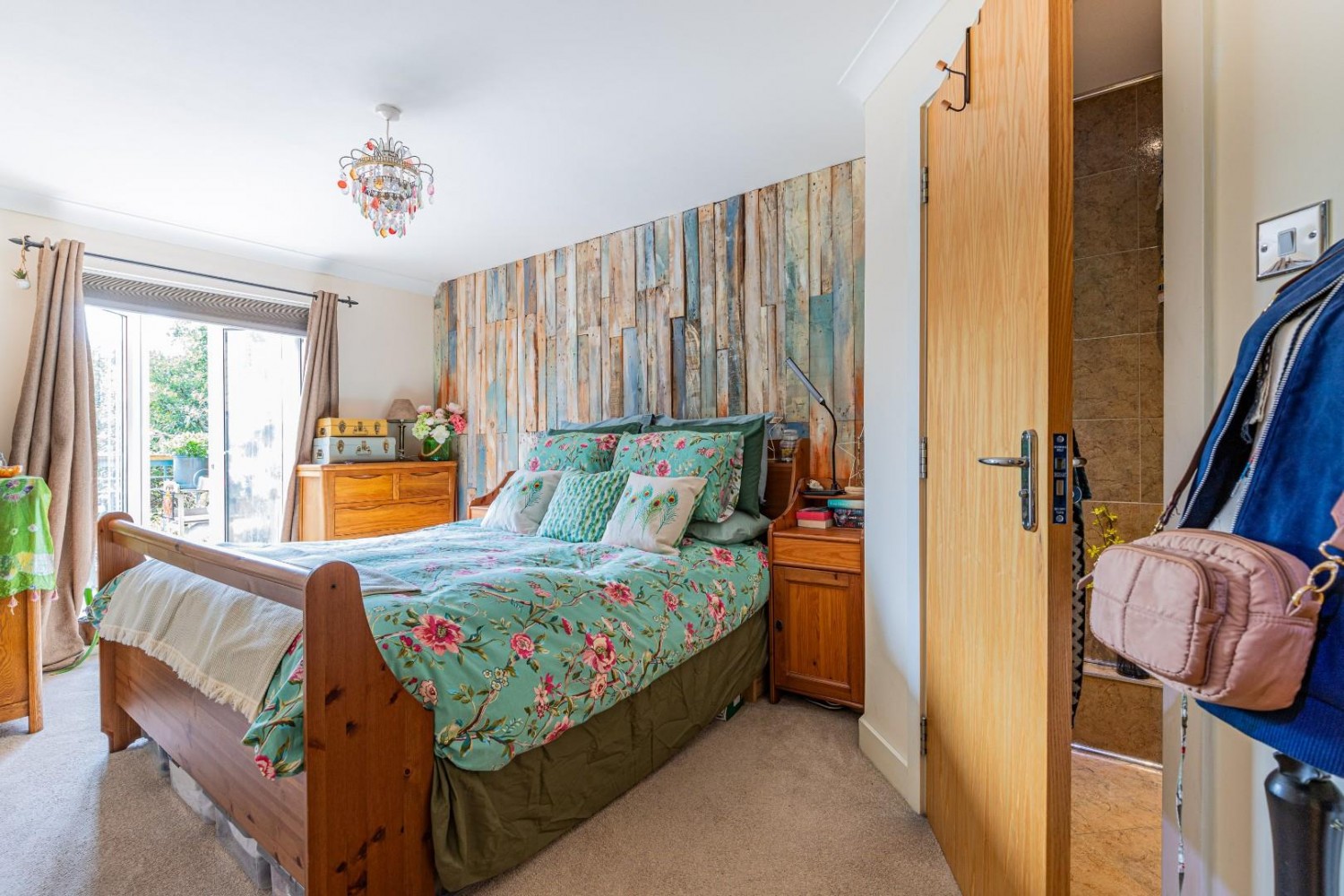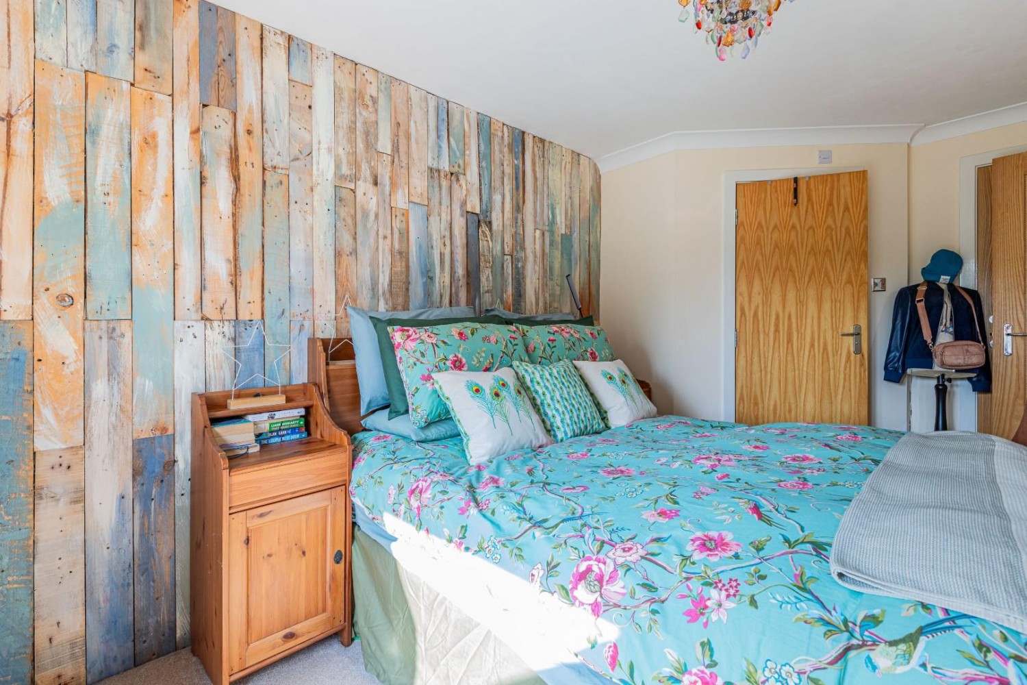 Large double bedroom with French doors opening onto the decked terrace, TV point, telephone point, contemporary feature timber wall, built in double hanging single wardrobe.