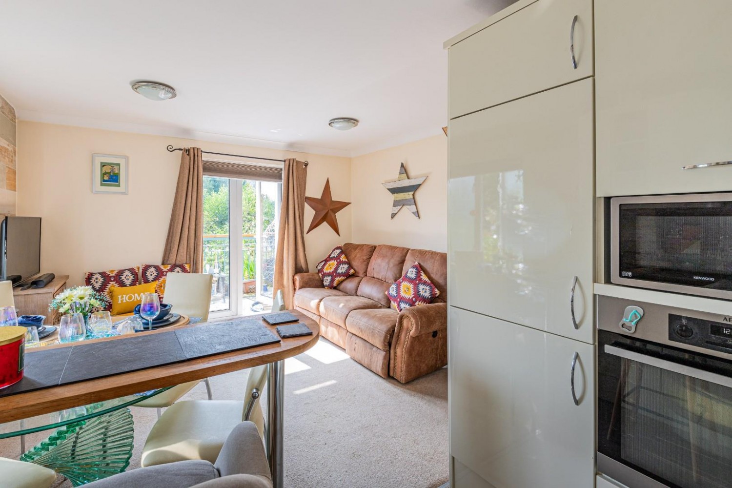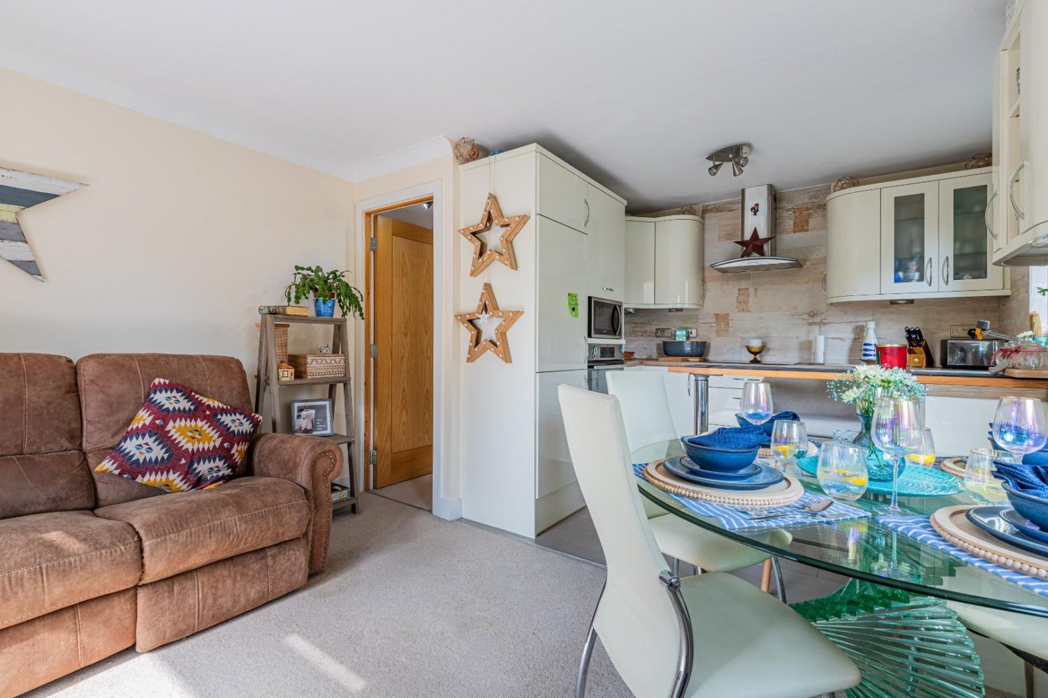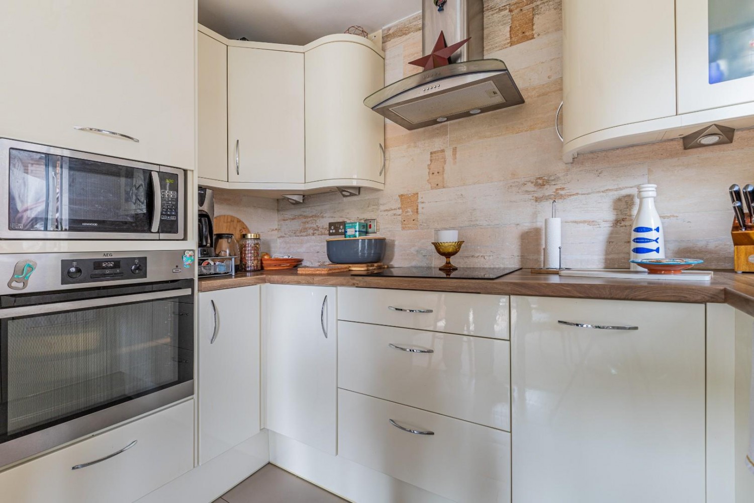Spacious open plan room combining the lounge to the kitchen, lounge area with side window plus French doors that lead onto the water facing terrace, TV point. The stunning kitchen installed by Crefft Kitchens with an extensive range of contemporary wall and base units with rounded corner cupboards and laminate worktop with inset stainless steel sink & drainer with mixer tap and Manderin stone surround, breakfast bar plus soft close doors & drawers and under lighting, integrated appliances include fridge, freezer, dishwasher, washing machine plus built in oven, induction hob & cooker hood, tiled floor, window to side.