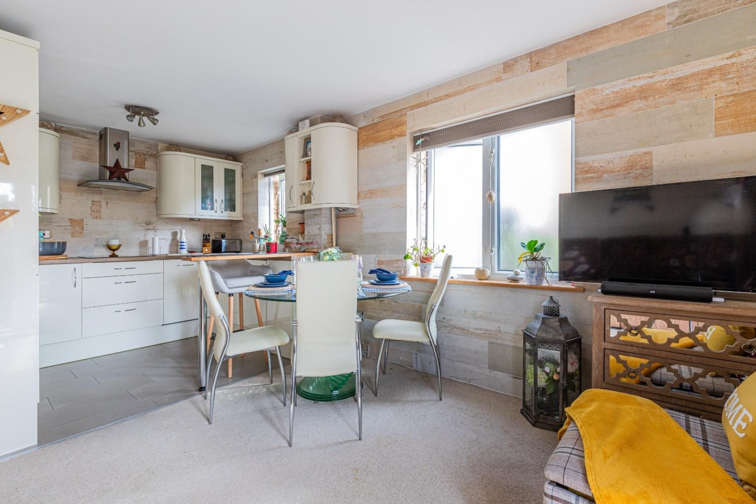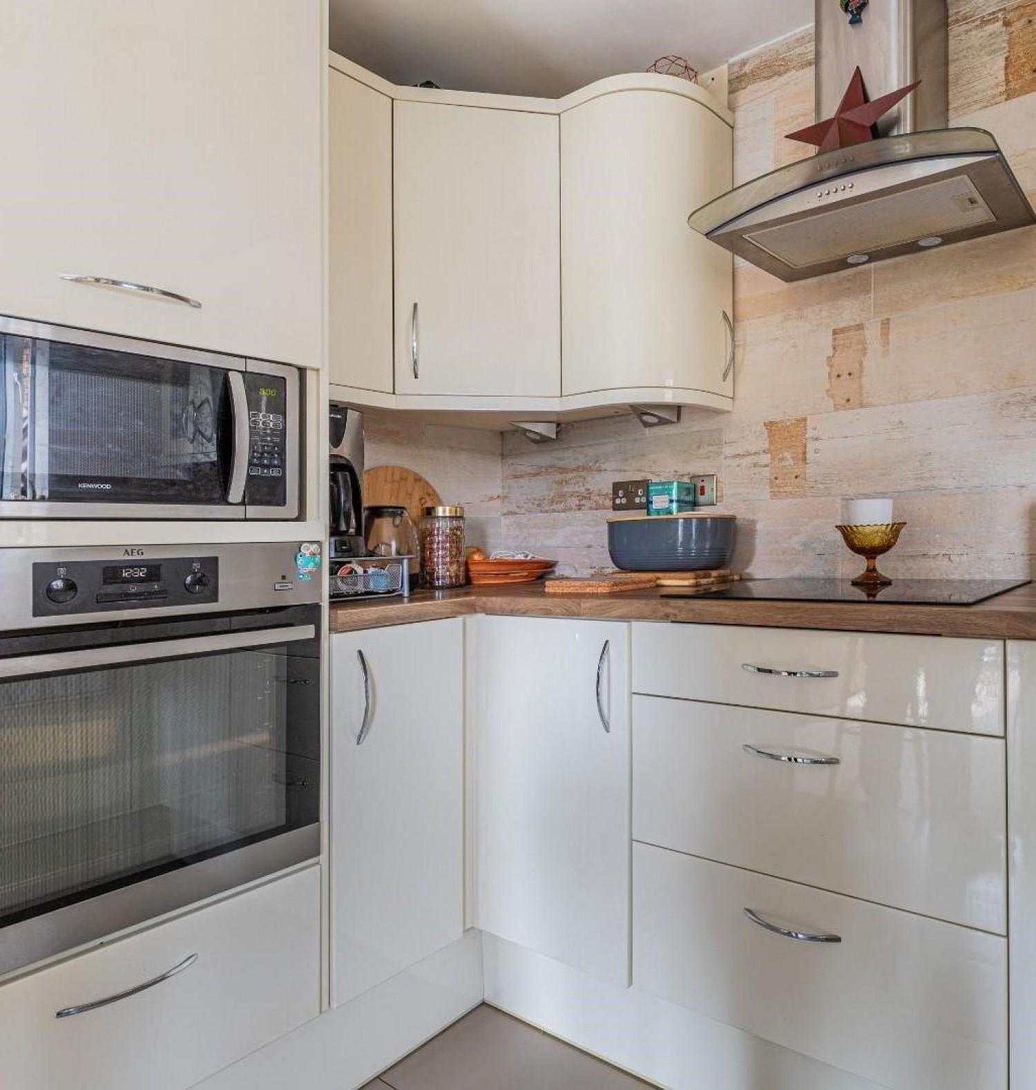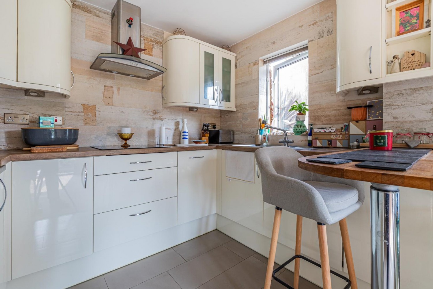 Spacious open plan room combining the lounge to the kitchen, lounge area with side window plus French doors that lead onto the water facing terrace, TV point. The stunning kitchen installed by Crefft Kitchens with an extensive range of contemporary wall and base units with rounded corner cupboards and laminate worktop with inset stainless steel sink & drainer with mixer tap and Manderin stone surround, breakfast bar plus soft close doors & drawers and under lighting, integrated appliances include fridge, freezer, dishwasher, washing machine plus built in oven, induction hob & cooker hood, tiled floor, window to side.