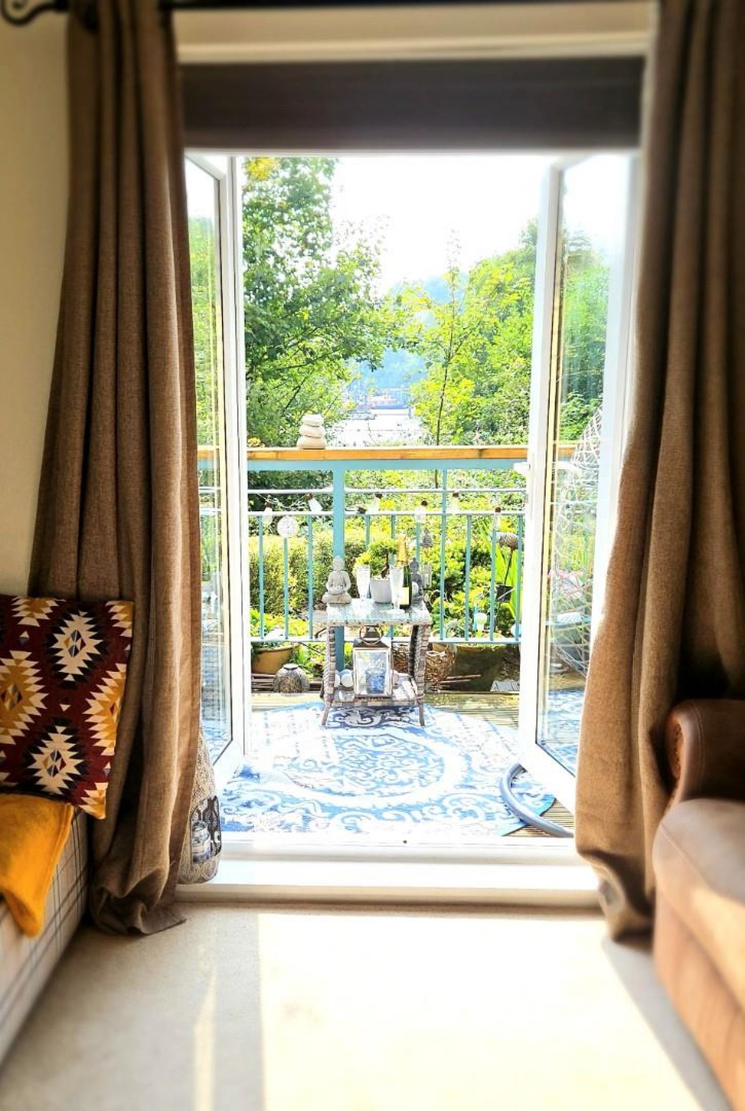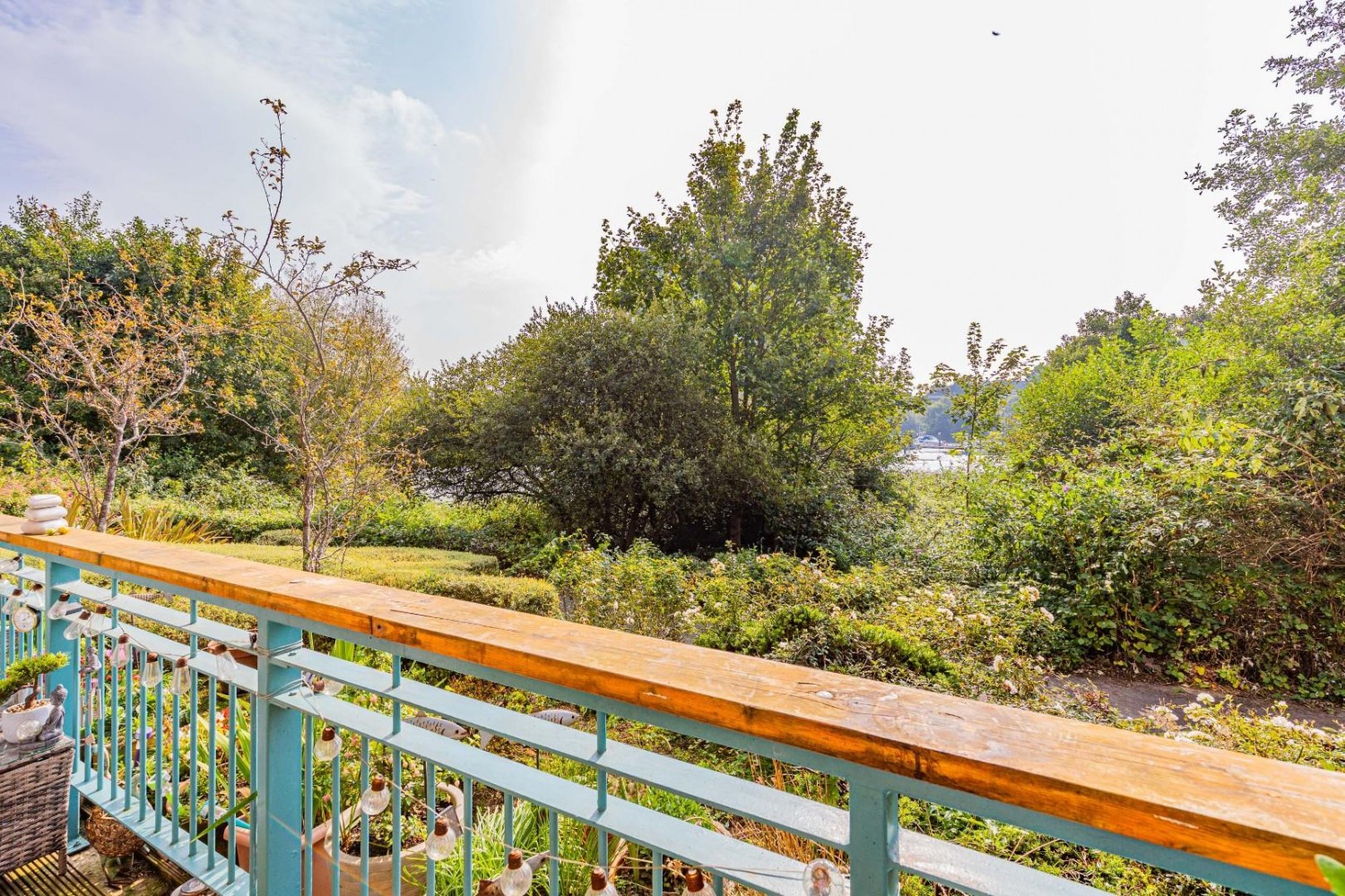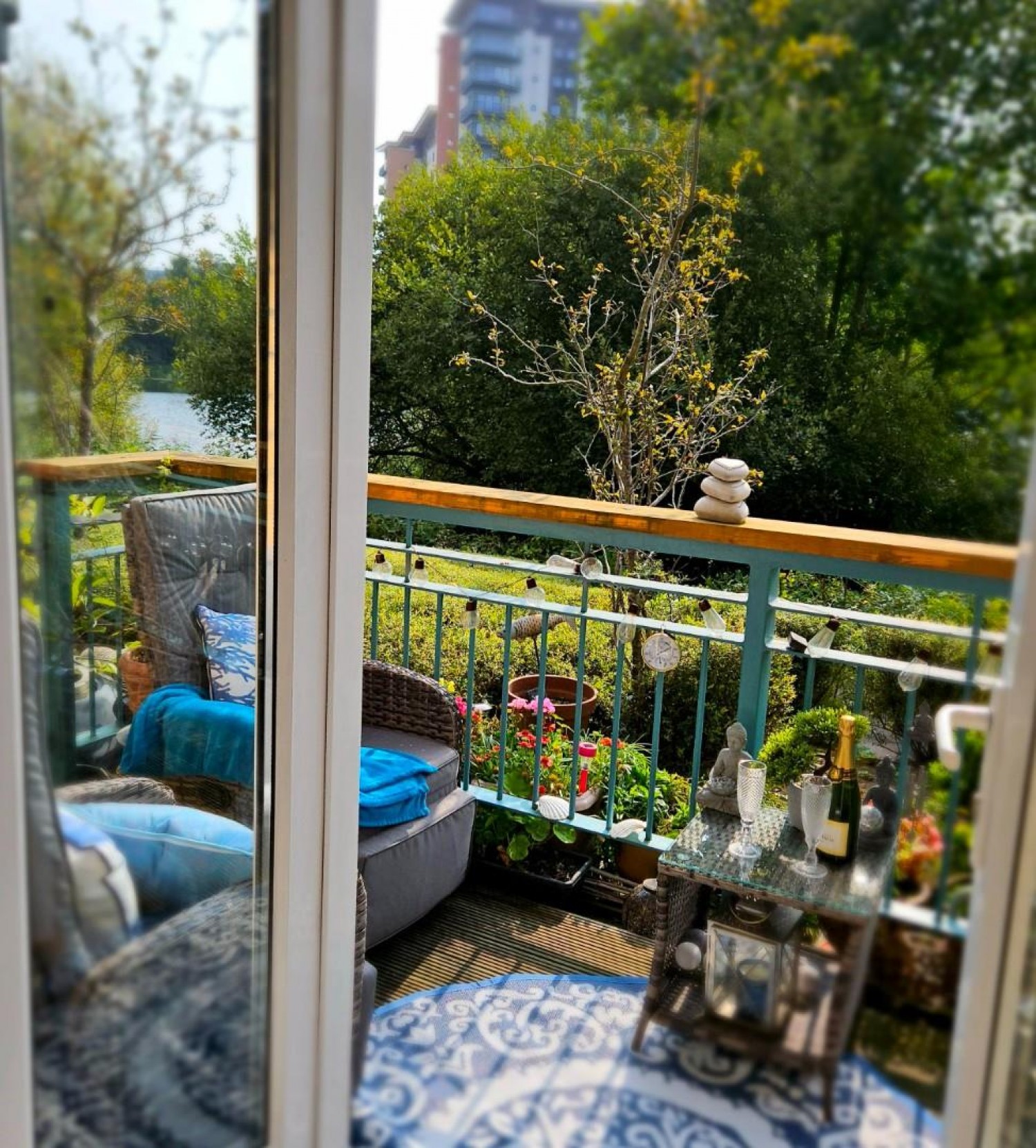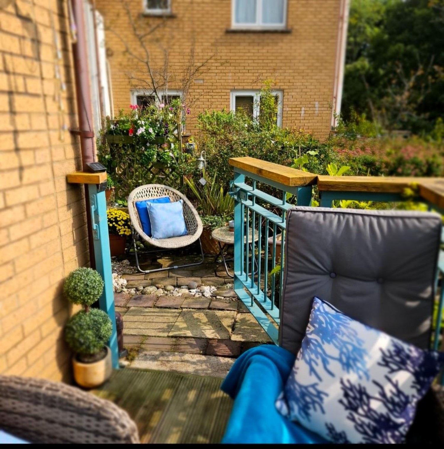Large decked terraced balcony - Southerly Facing and overlooking the River Ely and established shrub border, exterior lighting