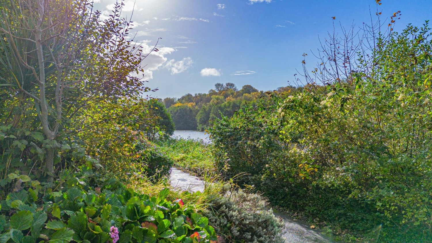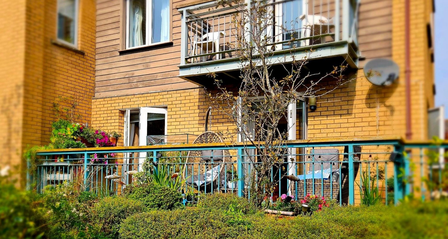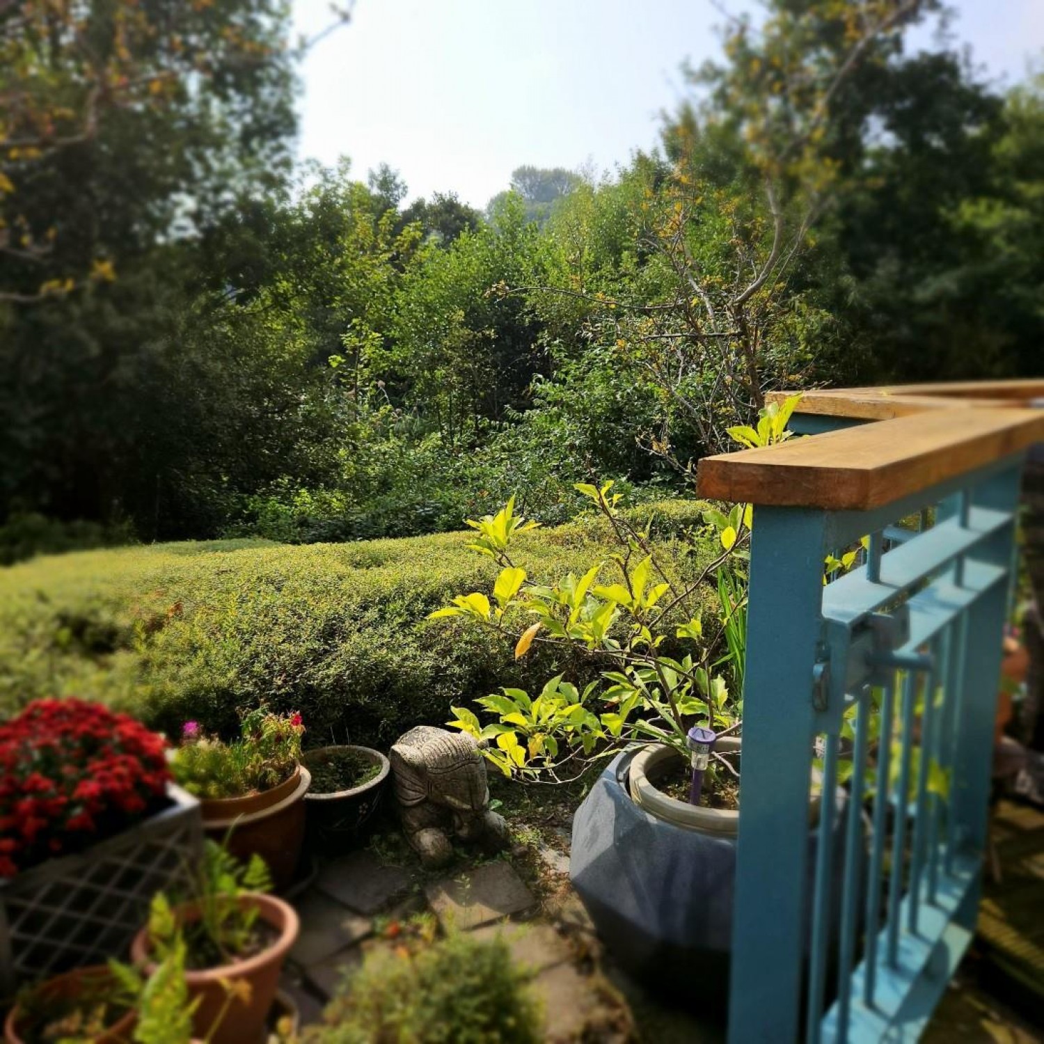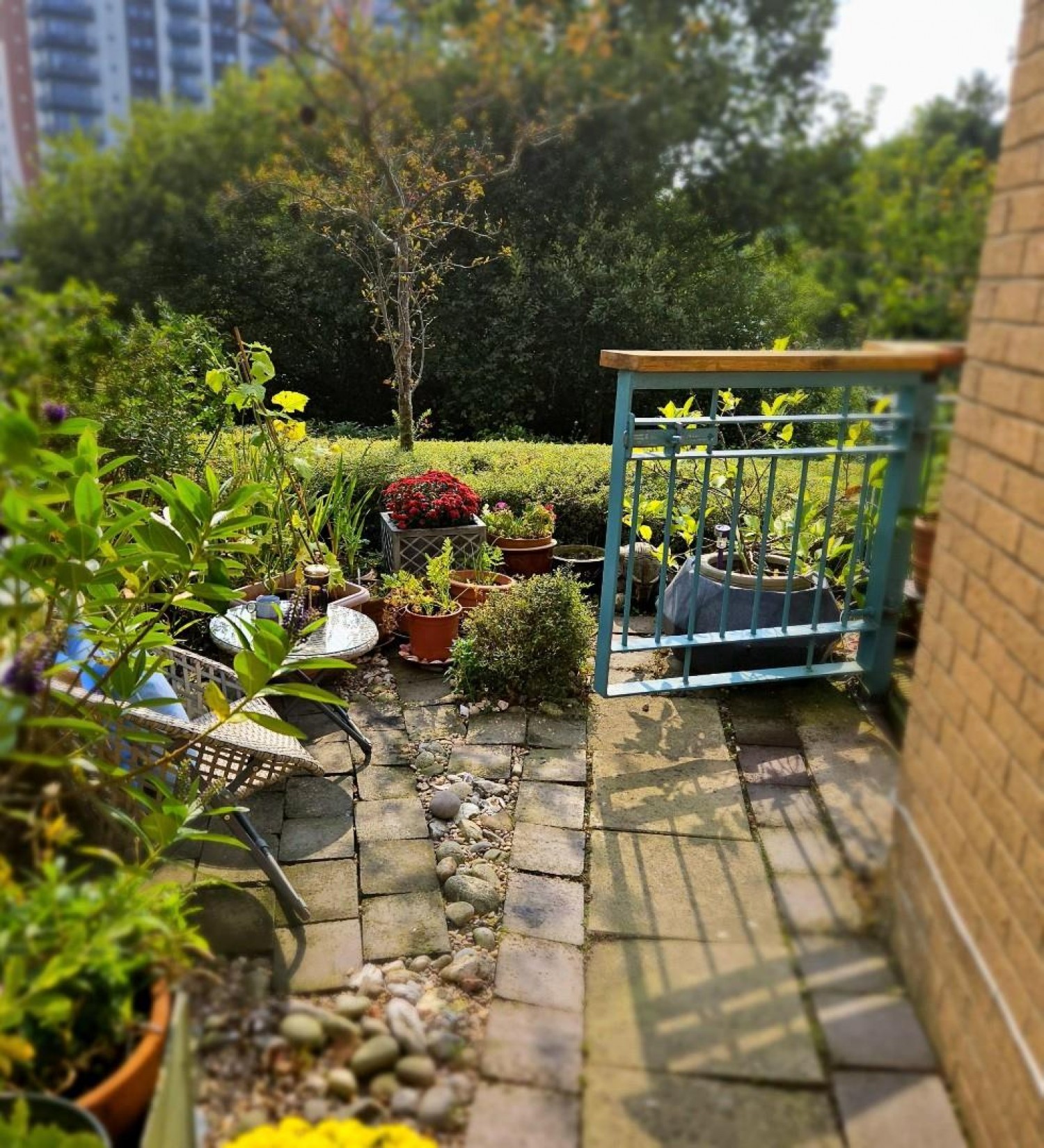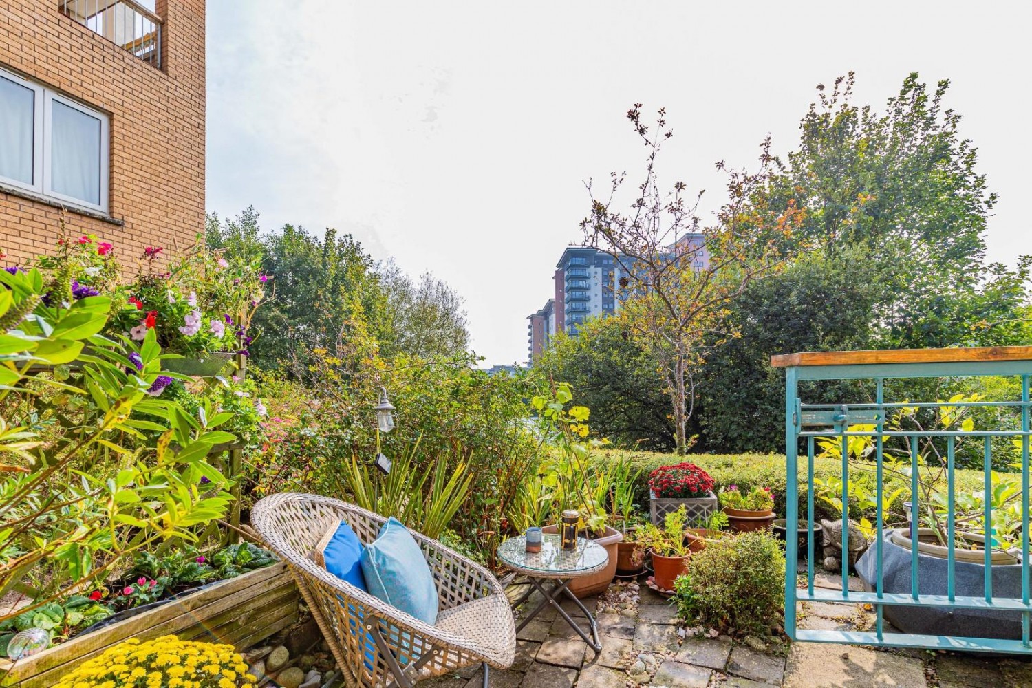 Large decked terraced balcony - Southerly Facing and overlooking the River Ely and established shrub border, exterior lighting