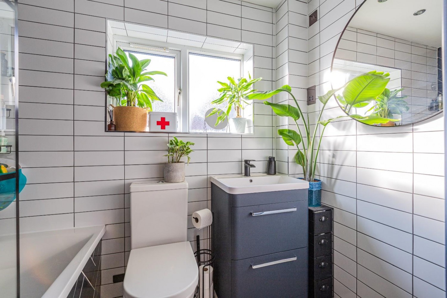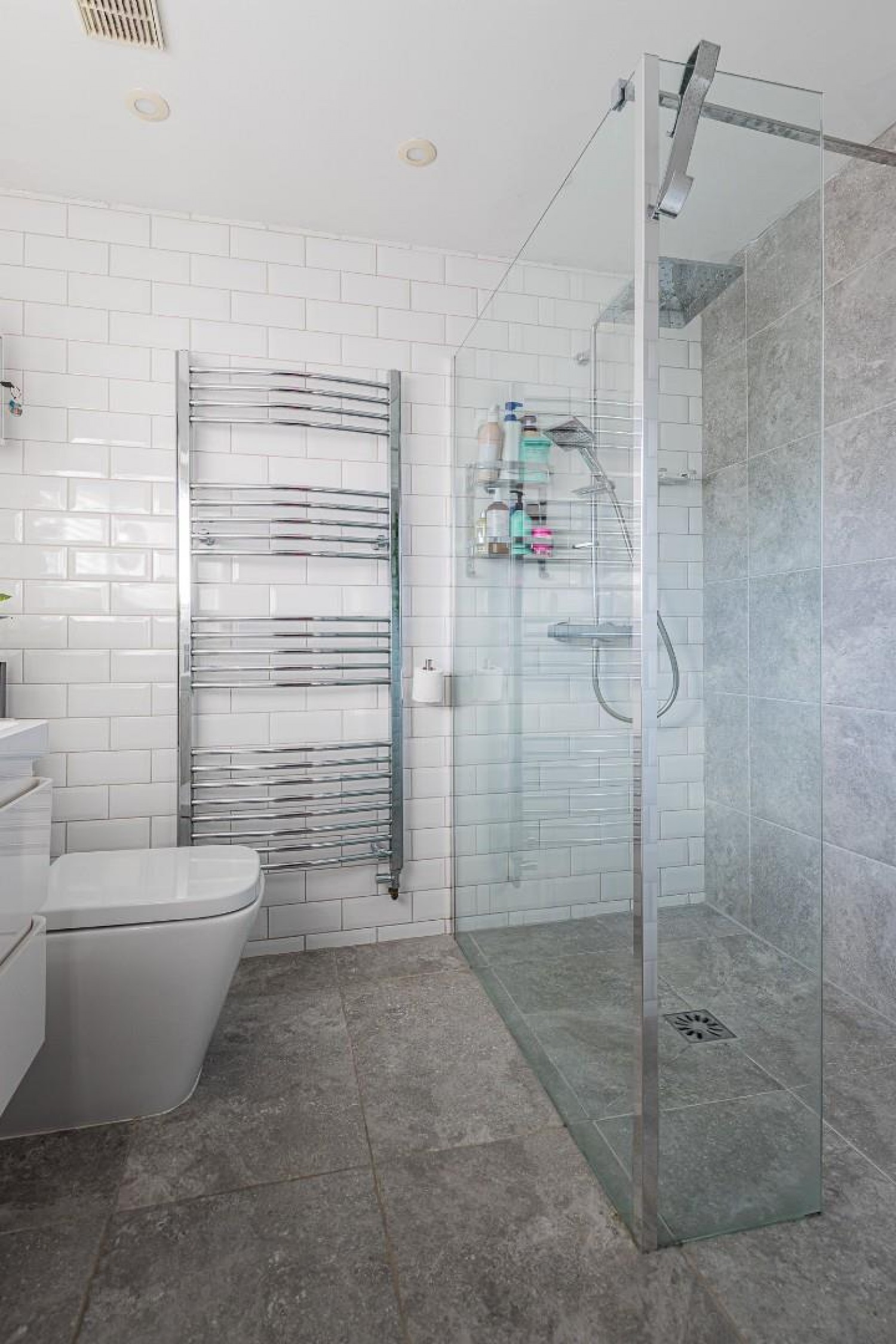 Refitted with a contemporary white suite comprising a tiled large shower area - glass screen, floating vanity wash hand basin - 2 soft close drawers plus close coupled wc, tiled walls and tiled floor - under floor heating, window to front, heated chrome towel rail, extractor fan.