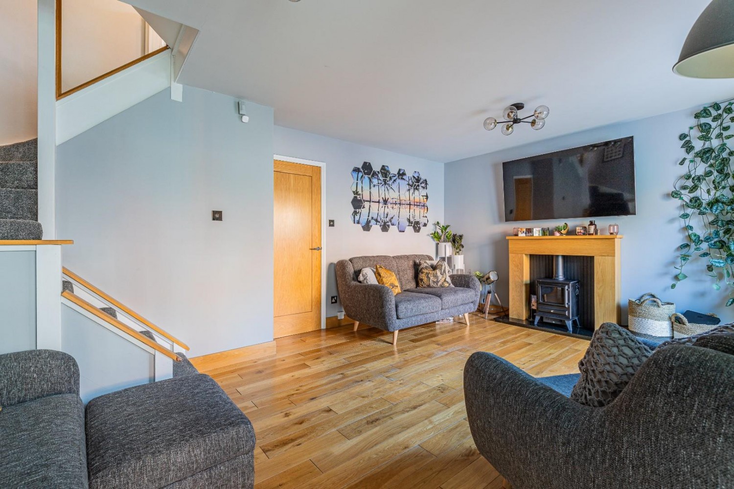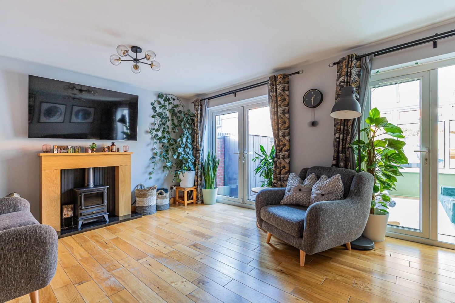 Spacious living room, oak flooring, stairs rise to the first floor, feature oak fire surround with granite hearth, French doors overlook and lead into the garden, TV point.