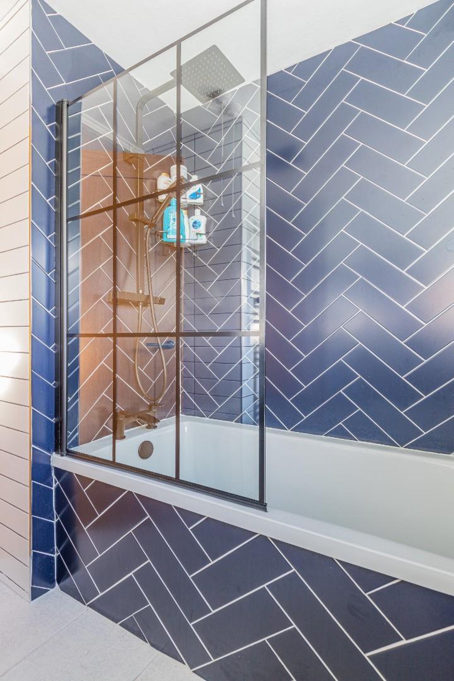 Stylishly appointed white suite comprising a tile panel bath with shower over and glass screen, vanity wash hand basin - 2 soft close drawers and close coupled wc, fully tiled and tiled floor - under floor heating, window to side, heated black towel rail, twin shaver point, extractor fan.