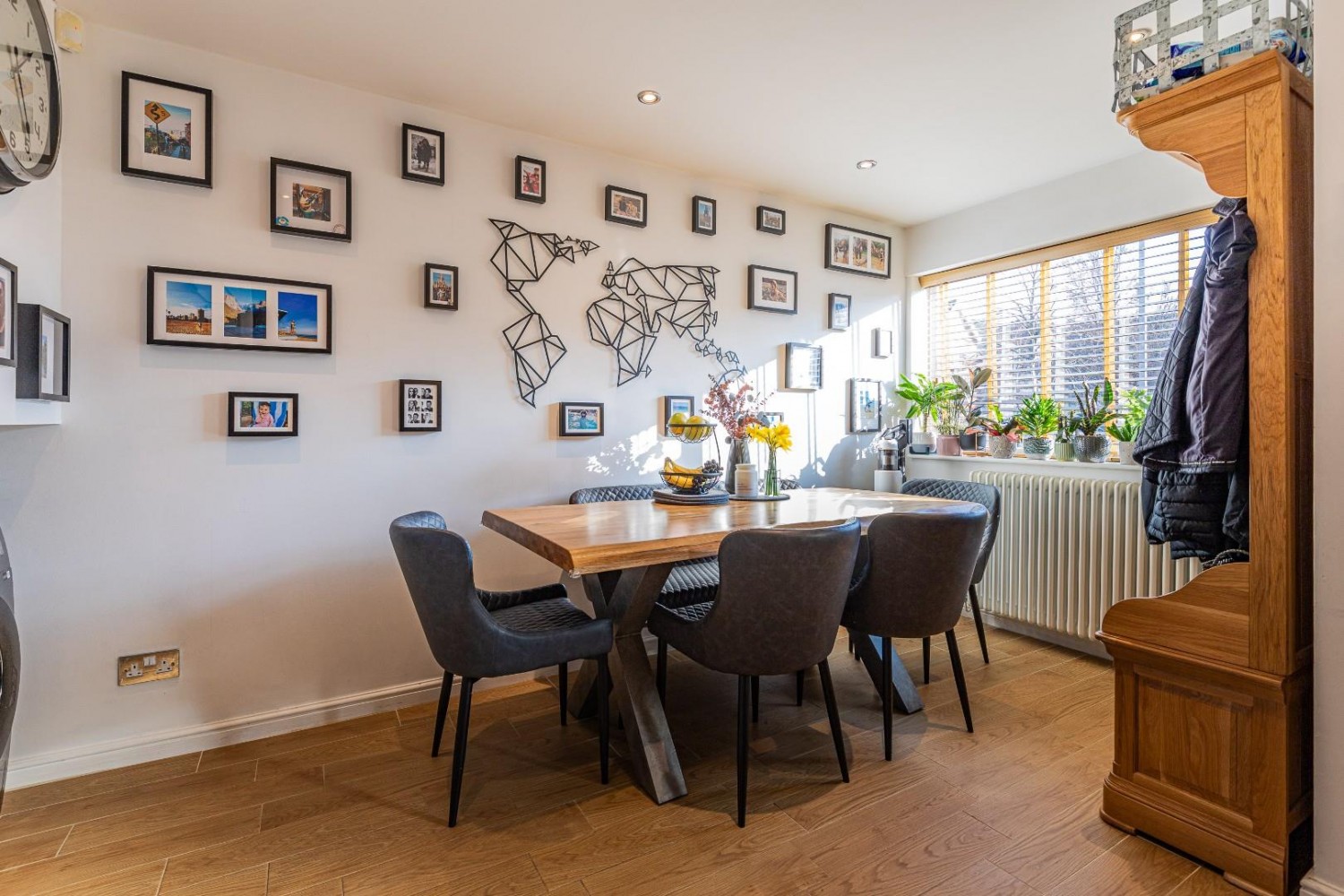 Impressively spacious room with ample space for dining table and chairs, 2 windows to front, wood effect tiled floor, Kitchen superbly refitted by Wren with an extensive range of contemporary wall and base units - laminate worktop and inset china one & half bowl sink & drainer with mixer tap and bevel tiled splash backs, features include pull out chrome larder unit, corner carousel plus soft close doors & drawers plus under lighting, built in Neff 'Hide & Slide' oven, built in Neff microwave oven, induction hob & cooker hood, plumbed for dishwasher and washing machine.