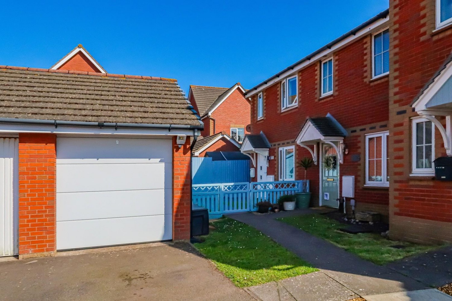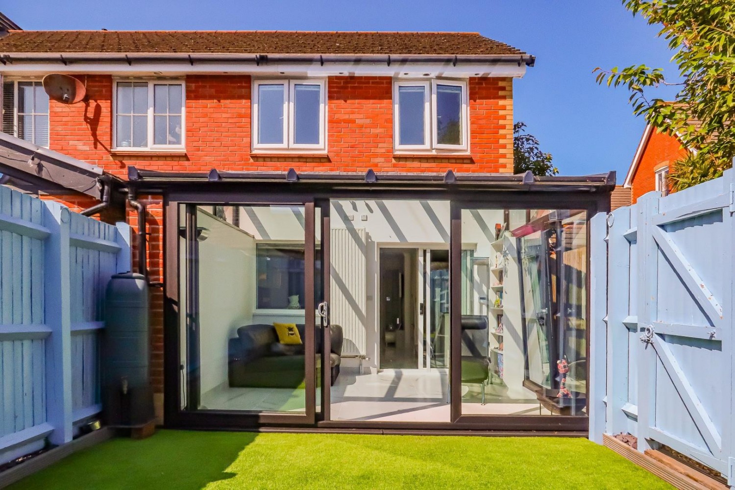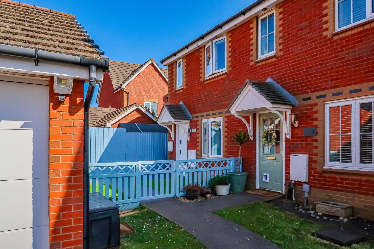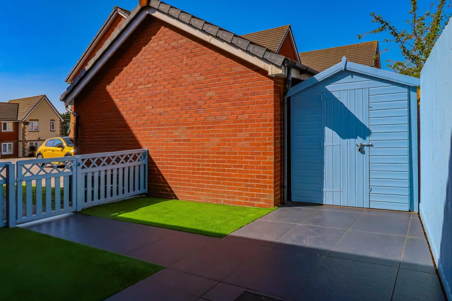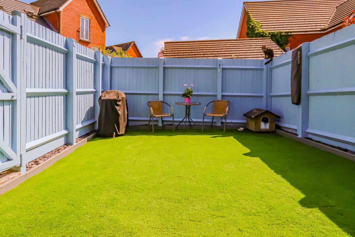 Neatly enclosed front garden with picket fence, quality artificial lawn and path to the front door, generous wooden garden shed to the corner, side access to the rear. Enclosed South facing rear garden - quality artificial lawn, feather edge fencing - side pedestrian gate.