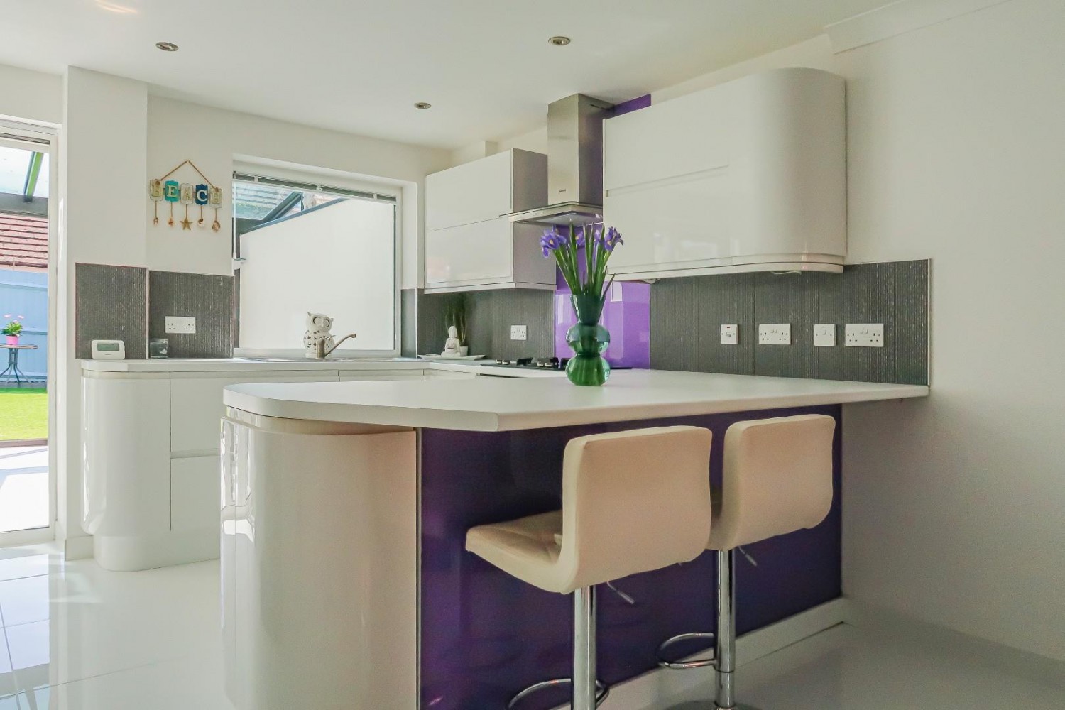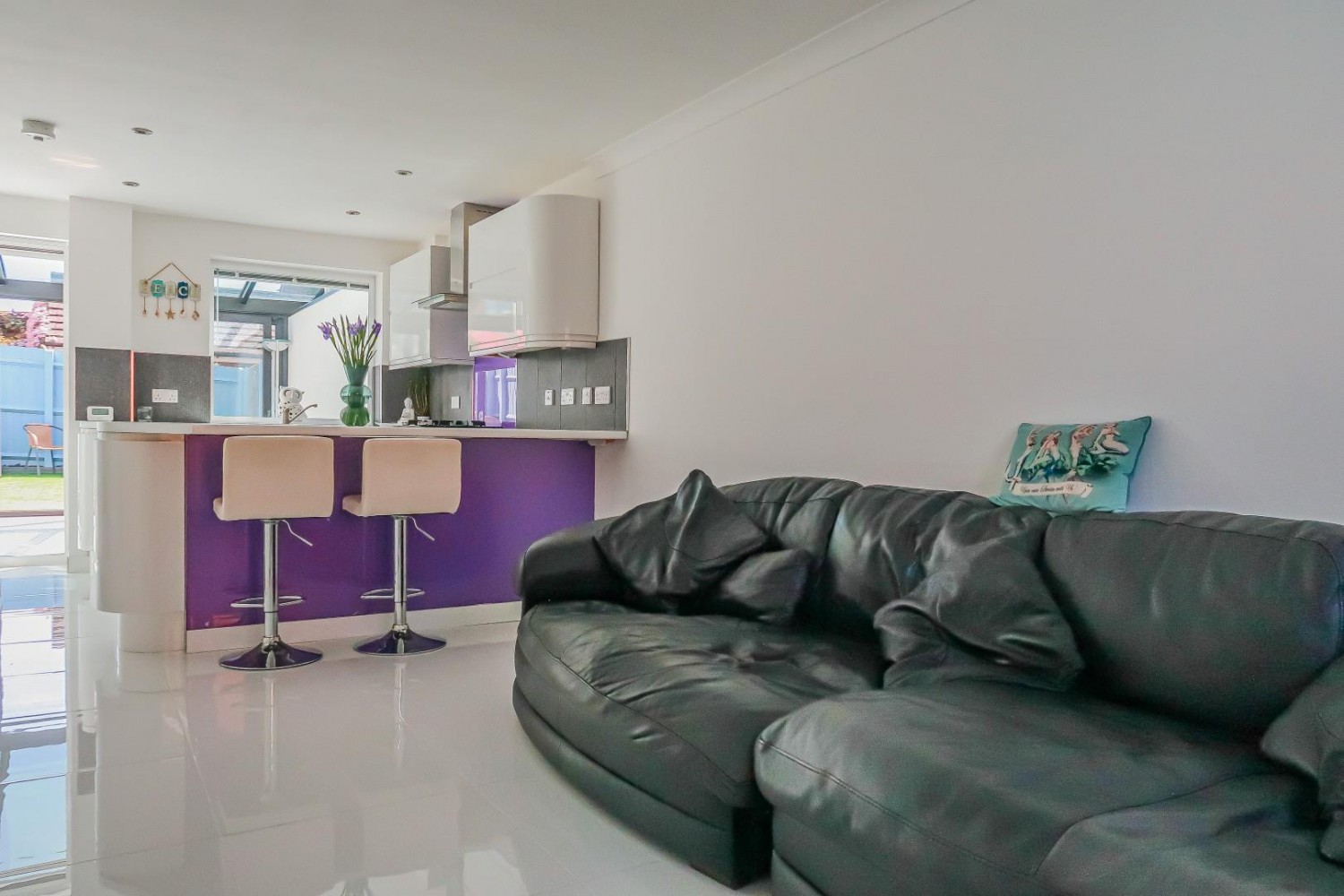 Contemporary open plan living at its finest . . . . Stunningly configured room combining the lounge with the kitchen, ceramic tiled flooring throughout, window to front, TV point, telephone point, under stairs storage, stairs rise to the first floor. the newly fitted kitchen - contemporary wall and base units with round edge laminate worktop including a breakfast bar divide, inset stainless steel one & half bowl sink & mixer tap, features include rounded corner cupboards plus soft close doors & drawers, integrated 2 drawer fridge with built in oven, hob & hood, plumbed for washing machine, window to rear with sliding patio doors leading into the conservatory.
