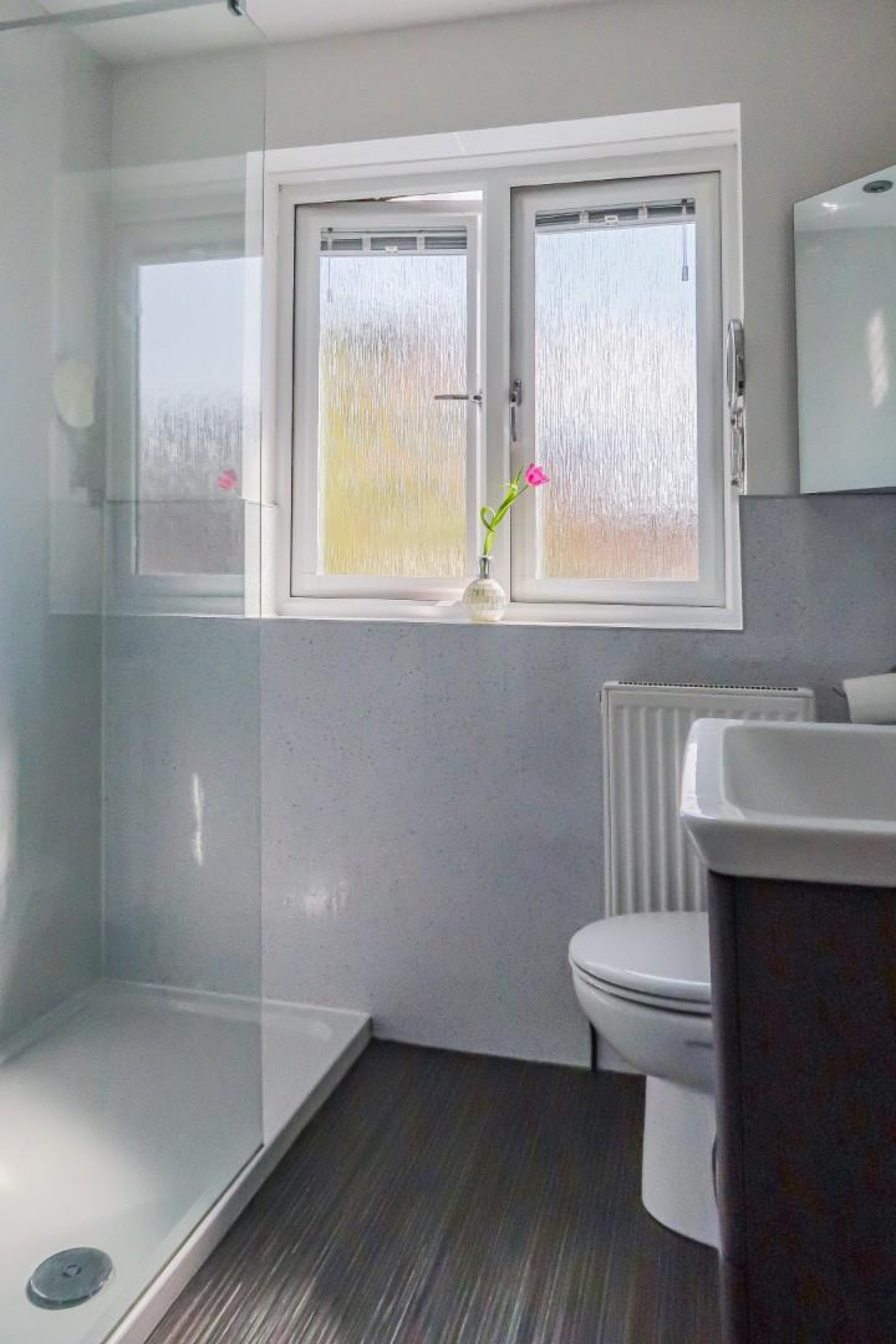 Stylishly appointed modern white suite comprising a full length shower area with glass screen and independent shower plus Roca 'Floating' vanity wash hand basin with 2 soft close drawers and a close coupled wc, window to rear, extractor fan.