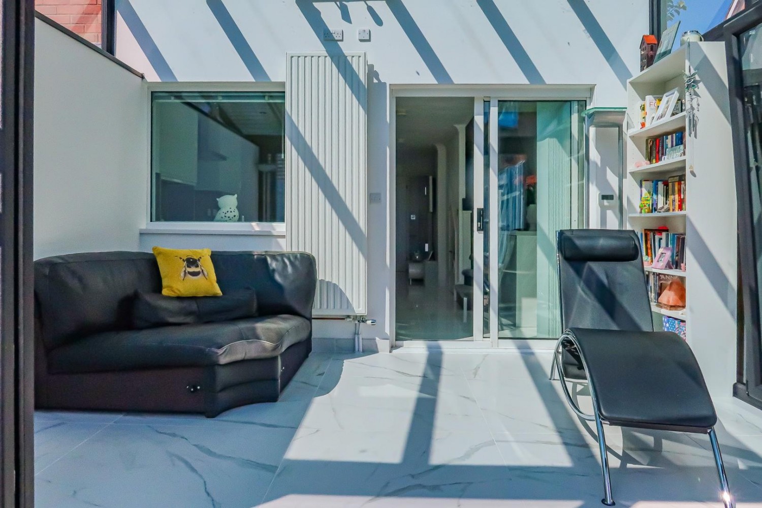 Contemporary extension to the property - fully double glazed with sloping clear glass roof, porcelain tiled floor, side tilt & turn door allowing side access with a sliding patio door and side glazed panel overlooking and allowing access into the garden.
