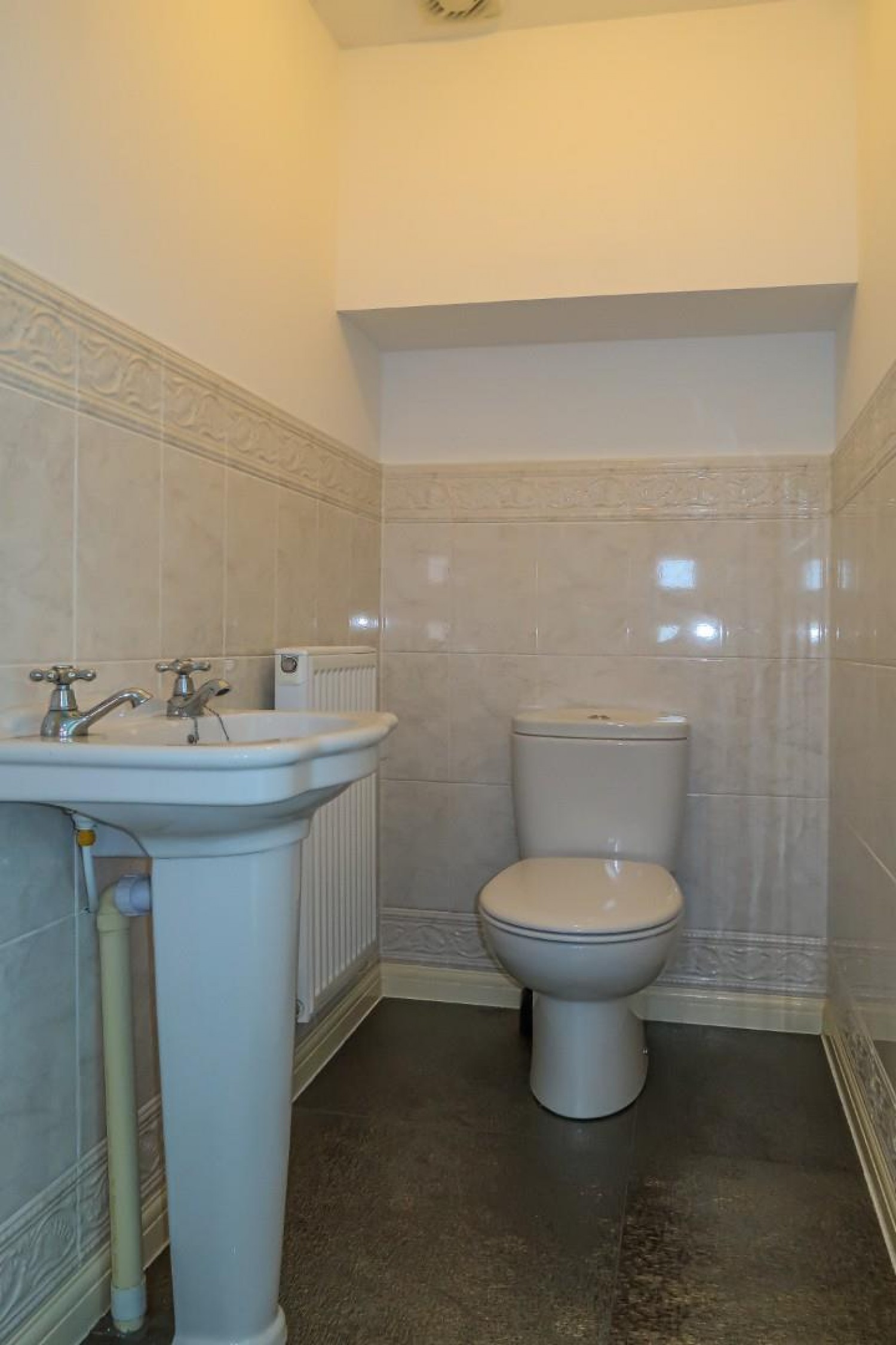 With modern white suite comprising a pedestal wash hand basin and close coupled wc, tiled surround, extractor fan.