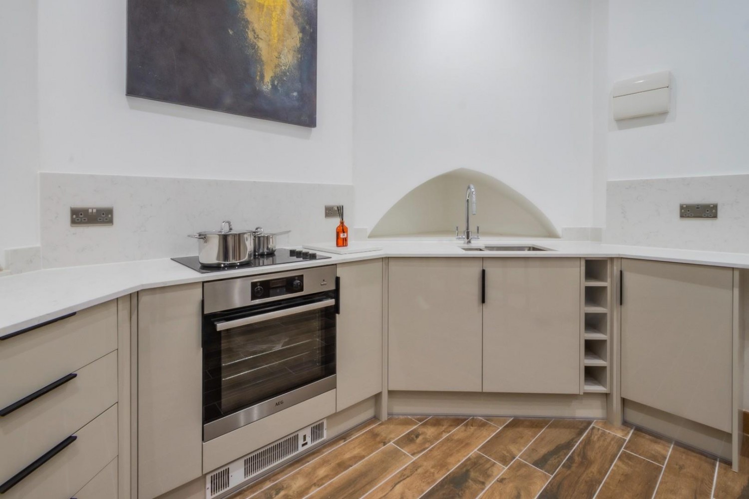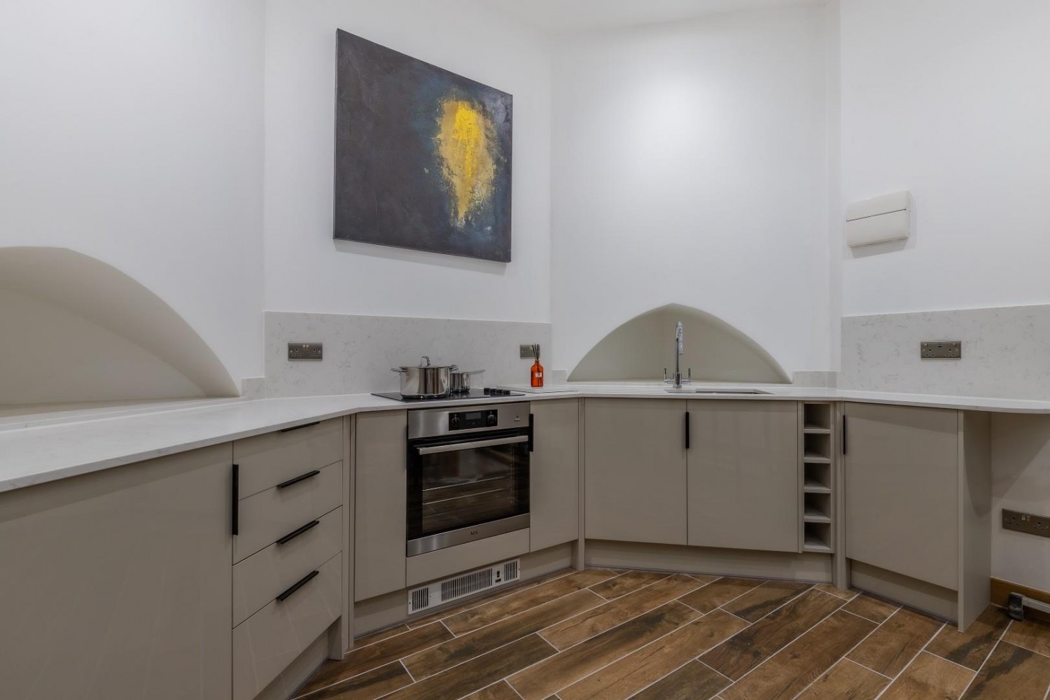Fitted appliance and space for breakfast table and chairs.