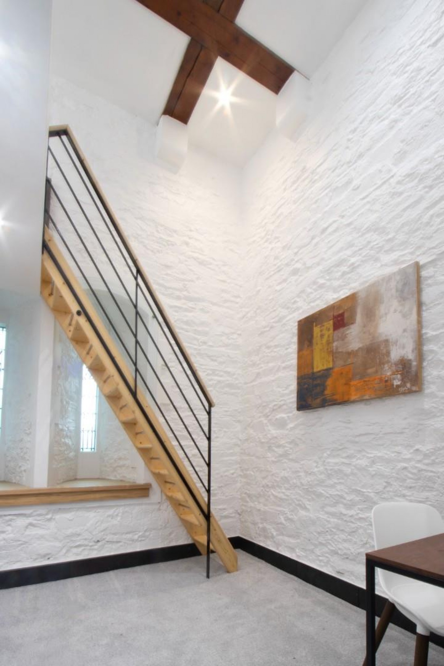 Stairs lead to mezzanine bed level with en-suite underneath