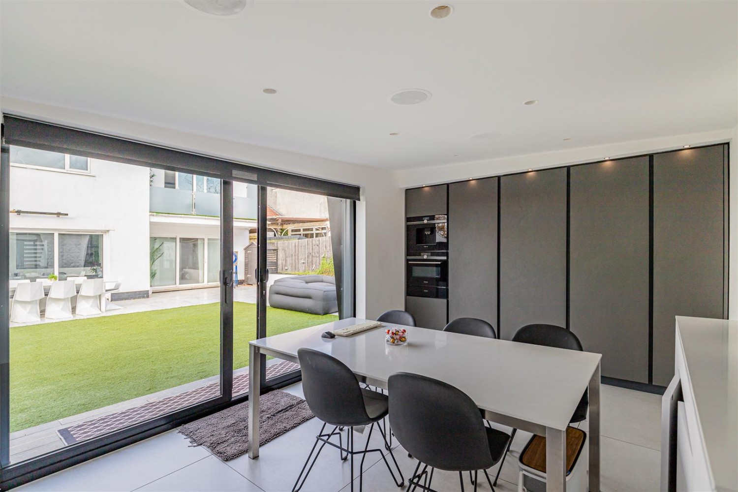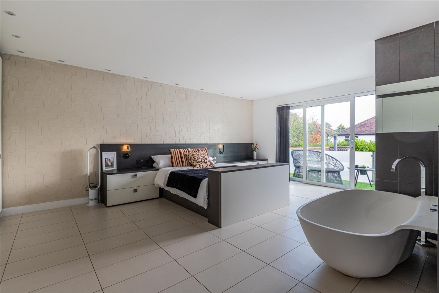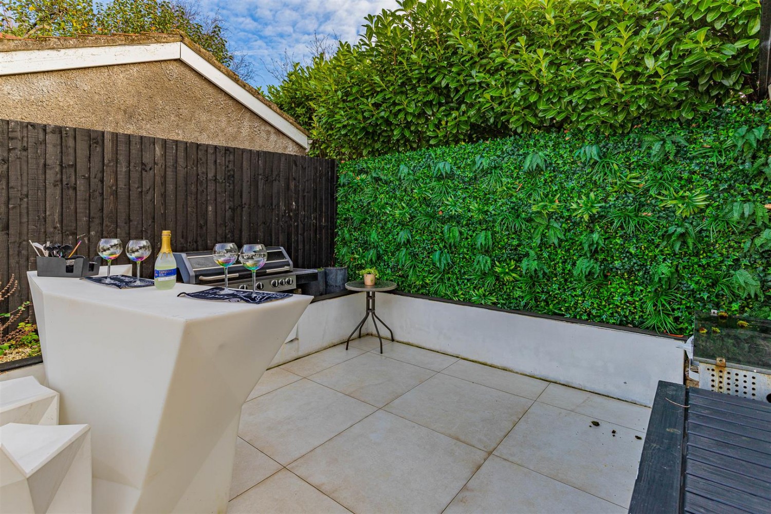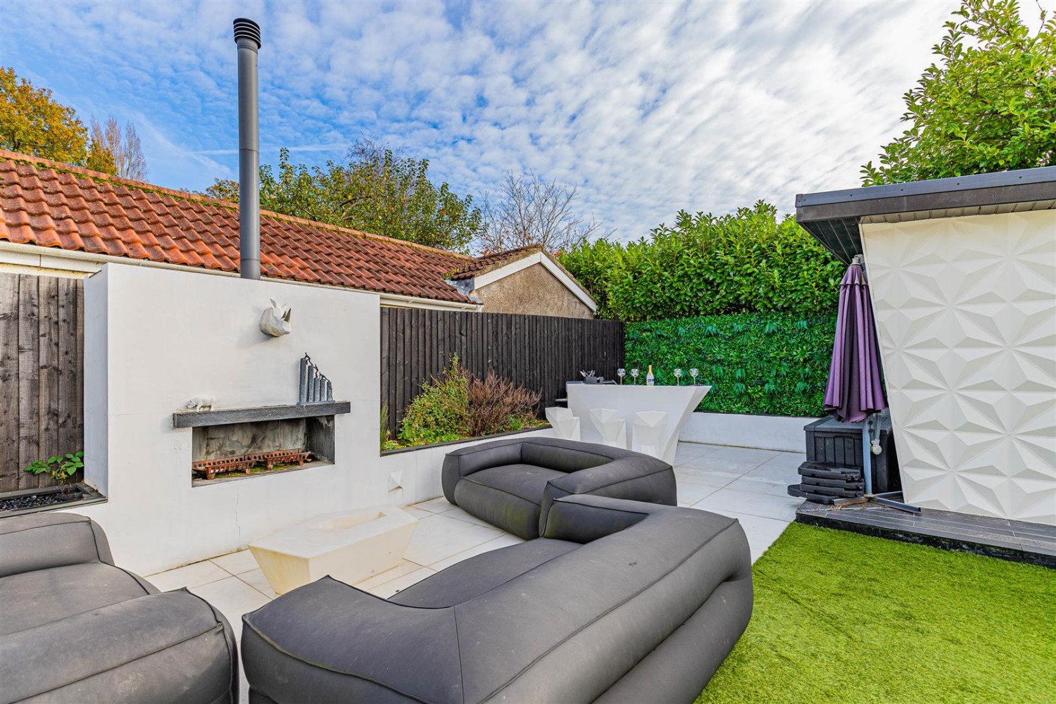 Low maintenance South East facing garden that benefits large patio area, fire pit and outside home office.