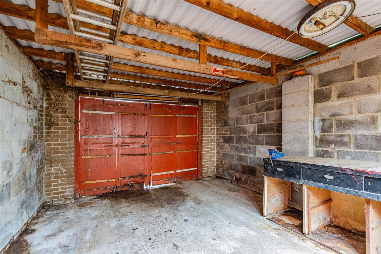 A good size brick built garage with folding wooden doors and a galvanised corrugated metal sheet roof.