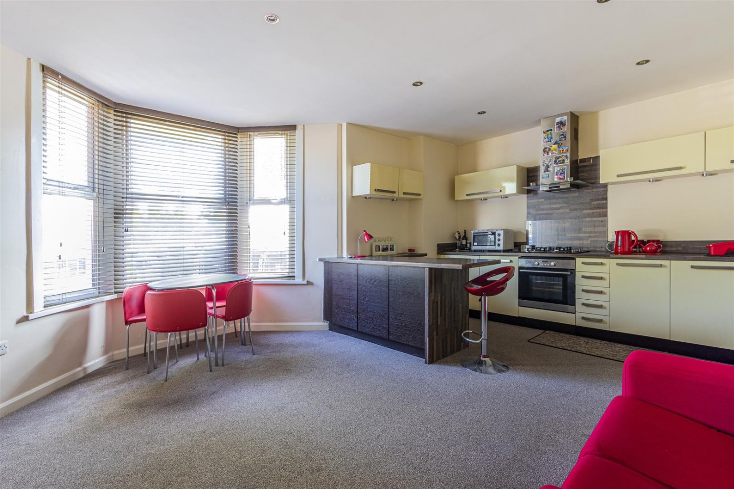 Bay fronted living room incorporating a well equipped kitchen. Double glazed bay window to the front elevation taking in views of the Taff Embankment. The kitchen area comprises of a good selection of modern cream gloss base and eye level units, with contrasting wood effect work surfaces. Built in oven with gas hob and extractor over. There is a built in dishwasher, washing machine and fridge with freezer box. A useful breakfast bar completes the kitchen area and segregates the room. Radiator