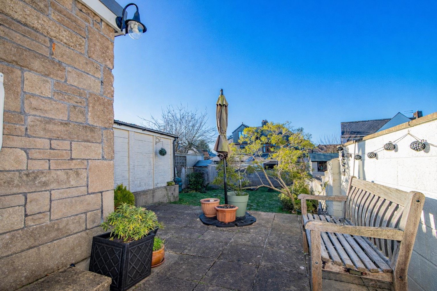 West facing family garden with raised patio area and side access to driveway and Garage