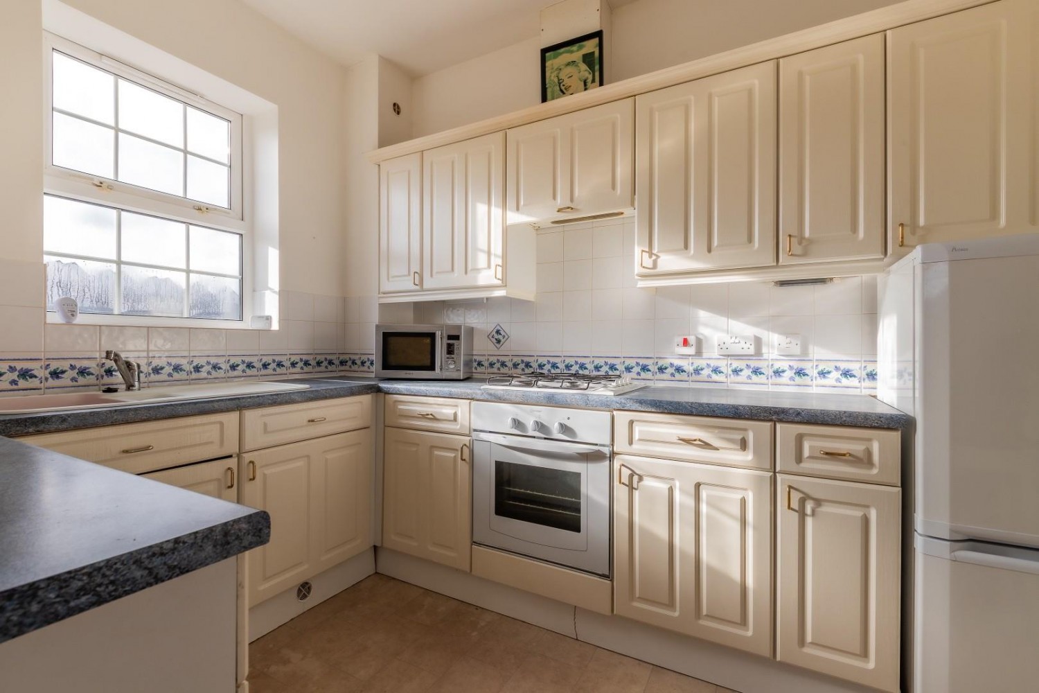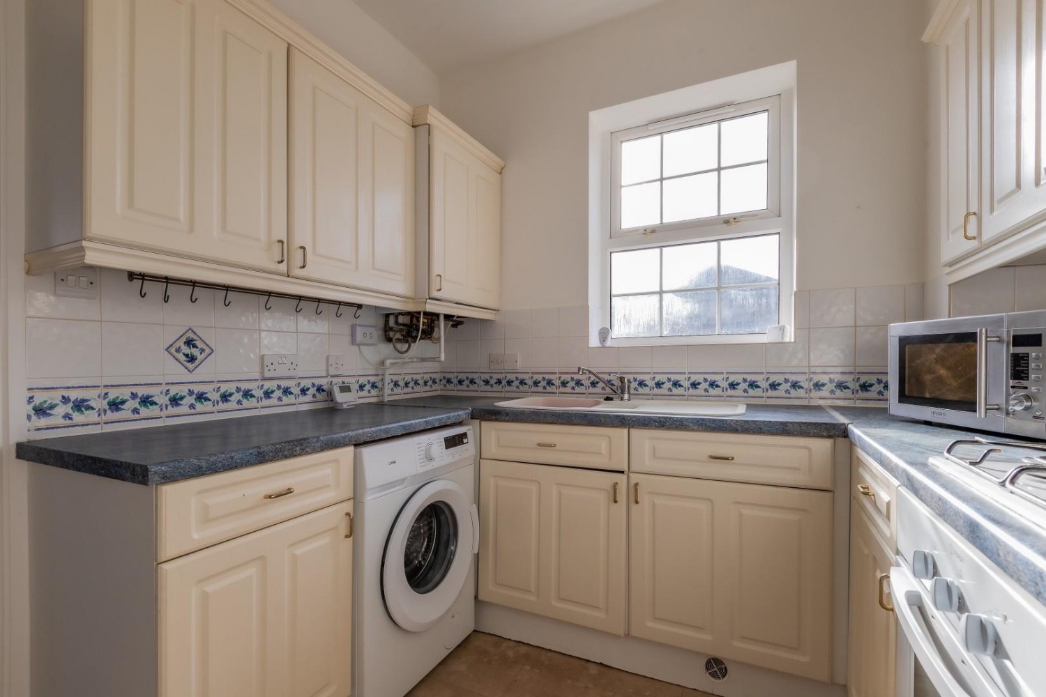 Fitted with a range of wall and base units with round edge worktop and sink with drainer and mixer tap plus tiled splash backs, under lighting, window to rear, built in oven, hob & cooker hood, space for fridge/freezer and tumble drier, plumbed for washing machine, concealed combination boiler.