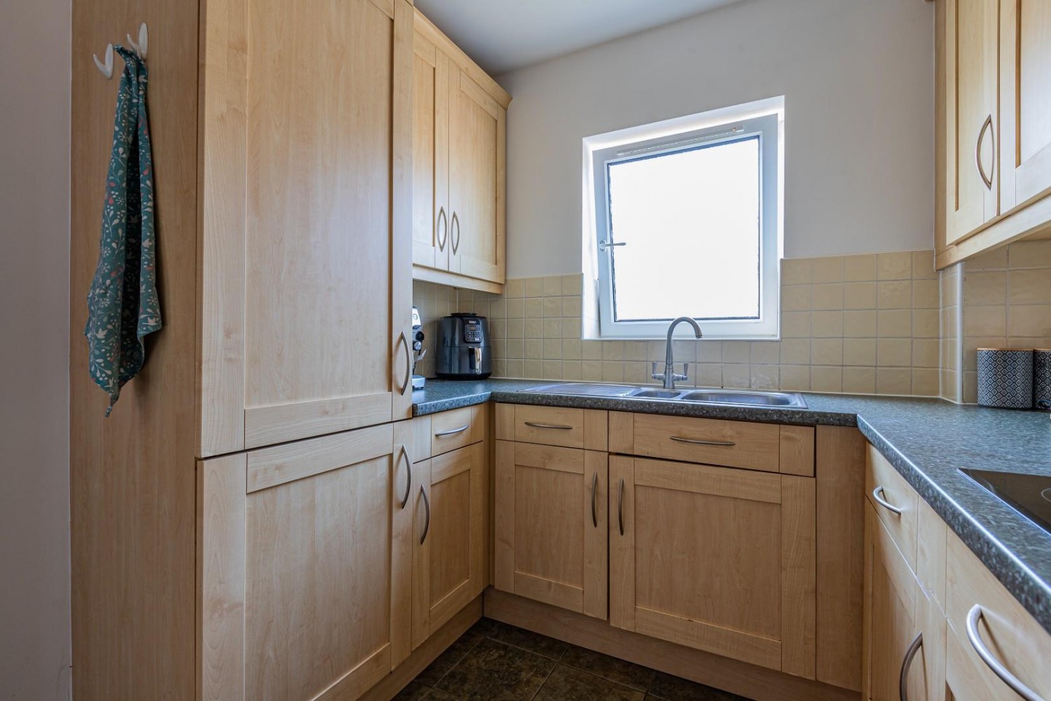 Extensively fitted with a range of wall and base units with round edge laminate worktops and inset stainless steel one & half bowl sink & drainer with mixer tap and tiled slash backs, integrated appliances include fridge, freezer, washing machine plus built in oven, hob & cooker hood with housing for a microwave oven, window to side, tiled floor, extractor fan.