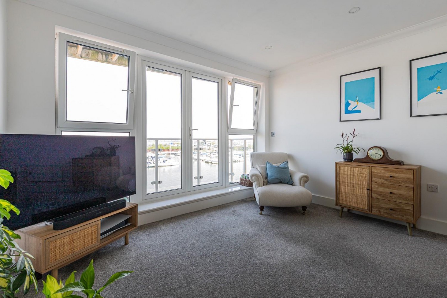 Spacious living room with French doors and glass side panels directly overlooking the yachts moored upon the river below and towards Cardiff Bay & beyond, TV point, telephone point.