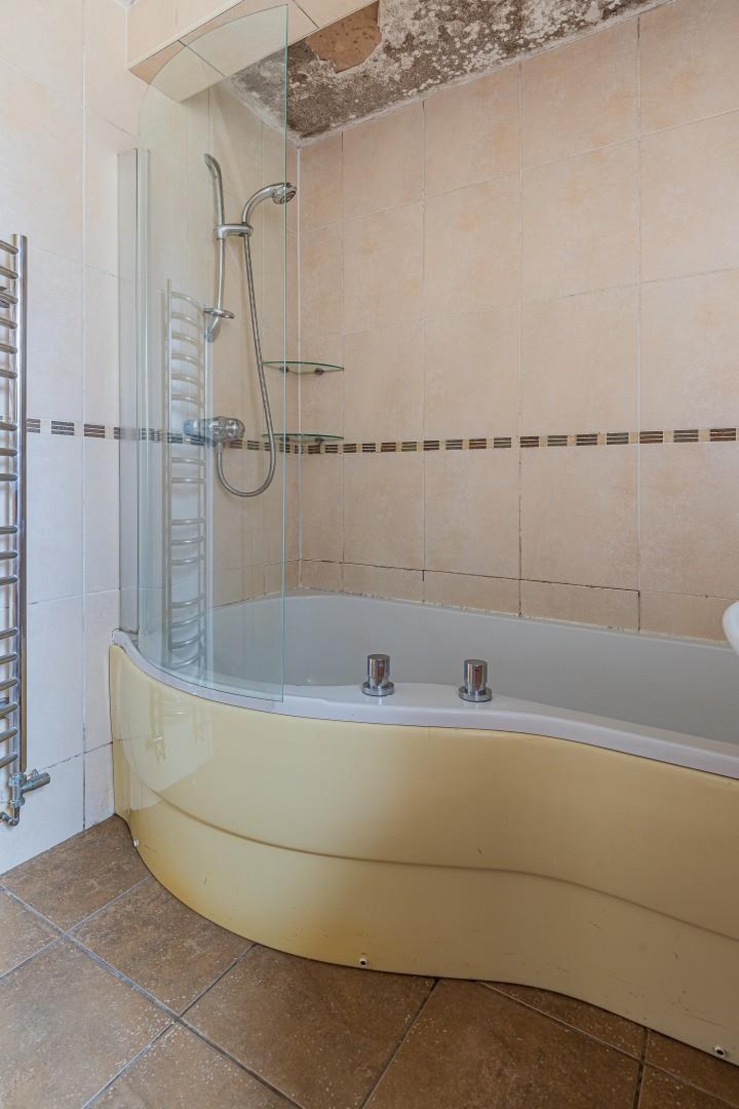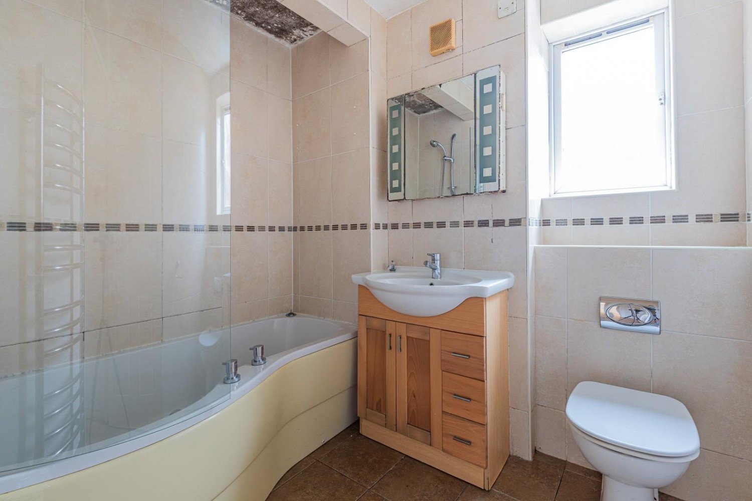 Modern white suite comprising a panel P shape bath with independent shower over and glass screen, vanity wash hand basin and close coupled wc - concealed cistern, fully tiled walls and tiled floor, heated chrome towel rail, extractor fan, window to rear.