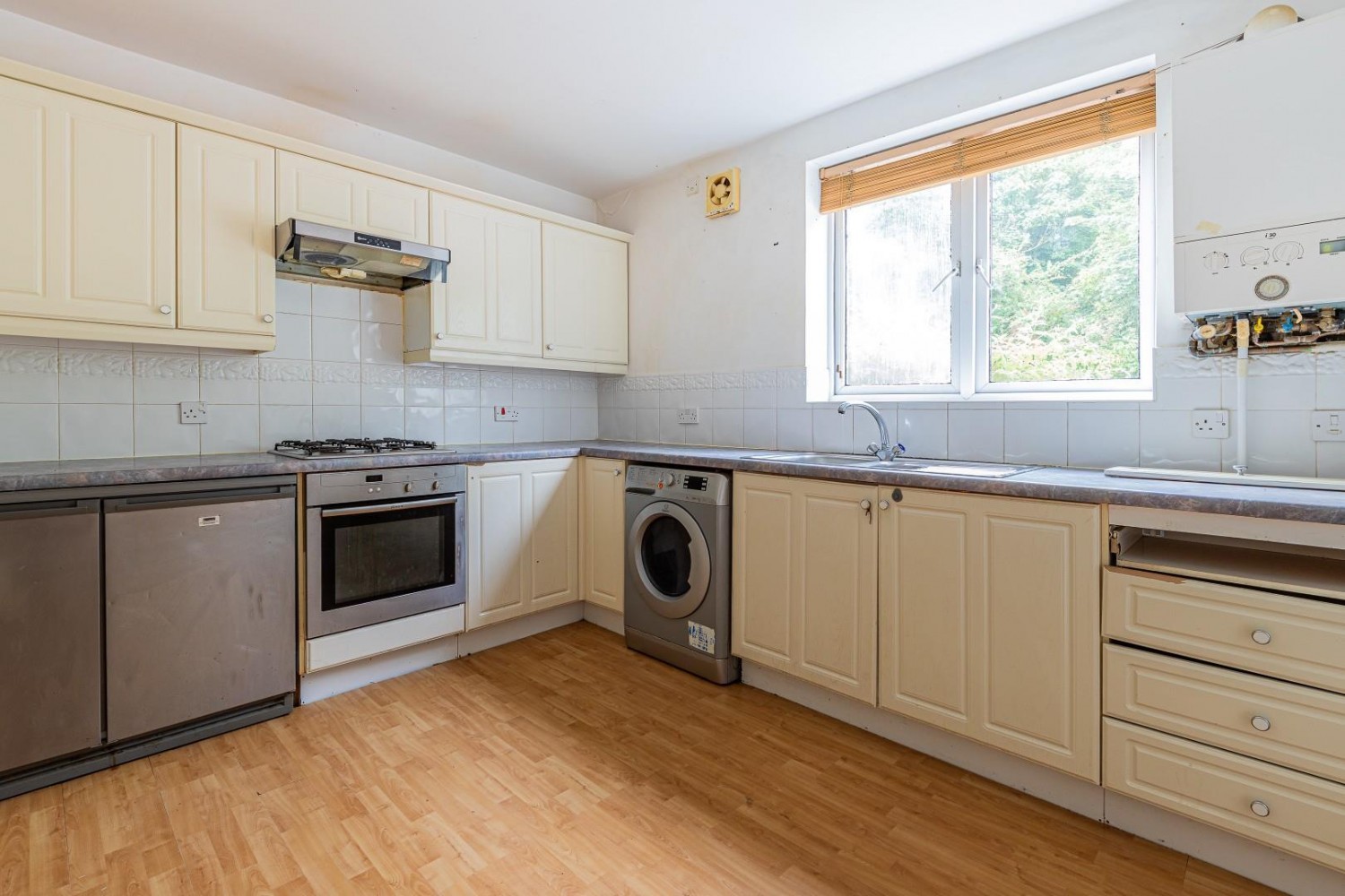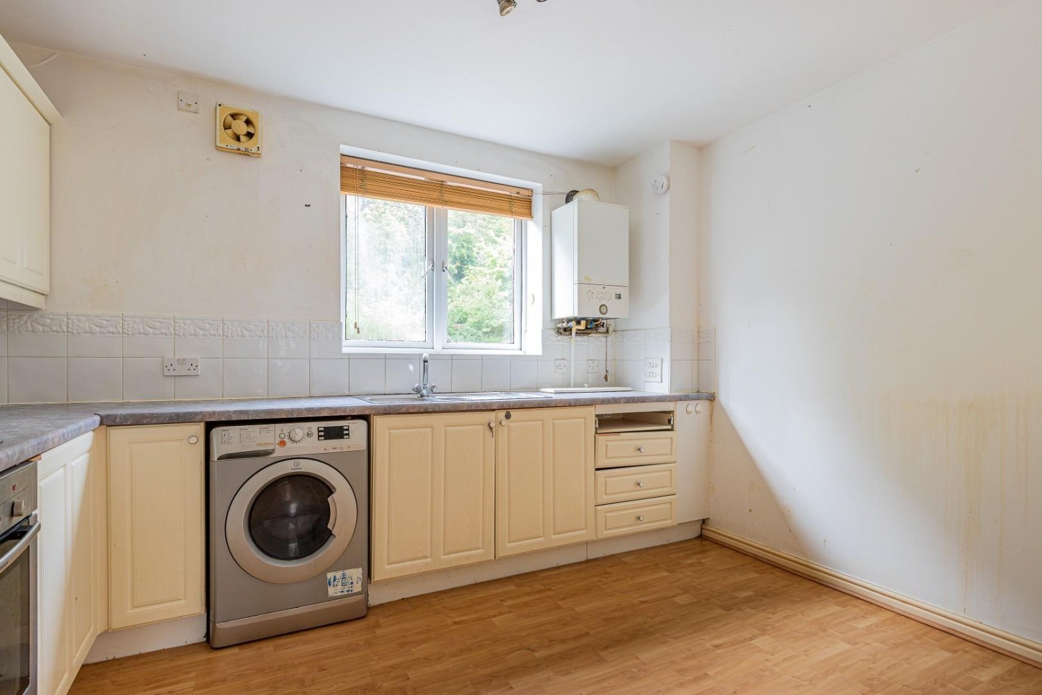 Fitted wall and base units with round edge worktop and inset stainless steel one & half bowl sink & drainer with mixer tap and tiled splash backs, plumbed for washing machine, space for fridge & freezer, built in oven, hob & hood, window to rear, space for table & chairs, wall mounted combination boiler.