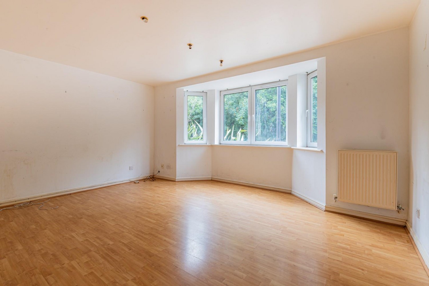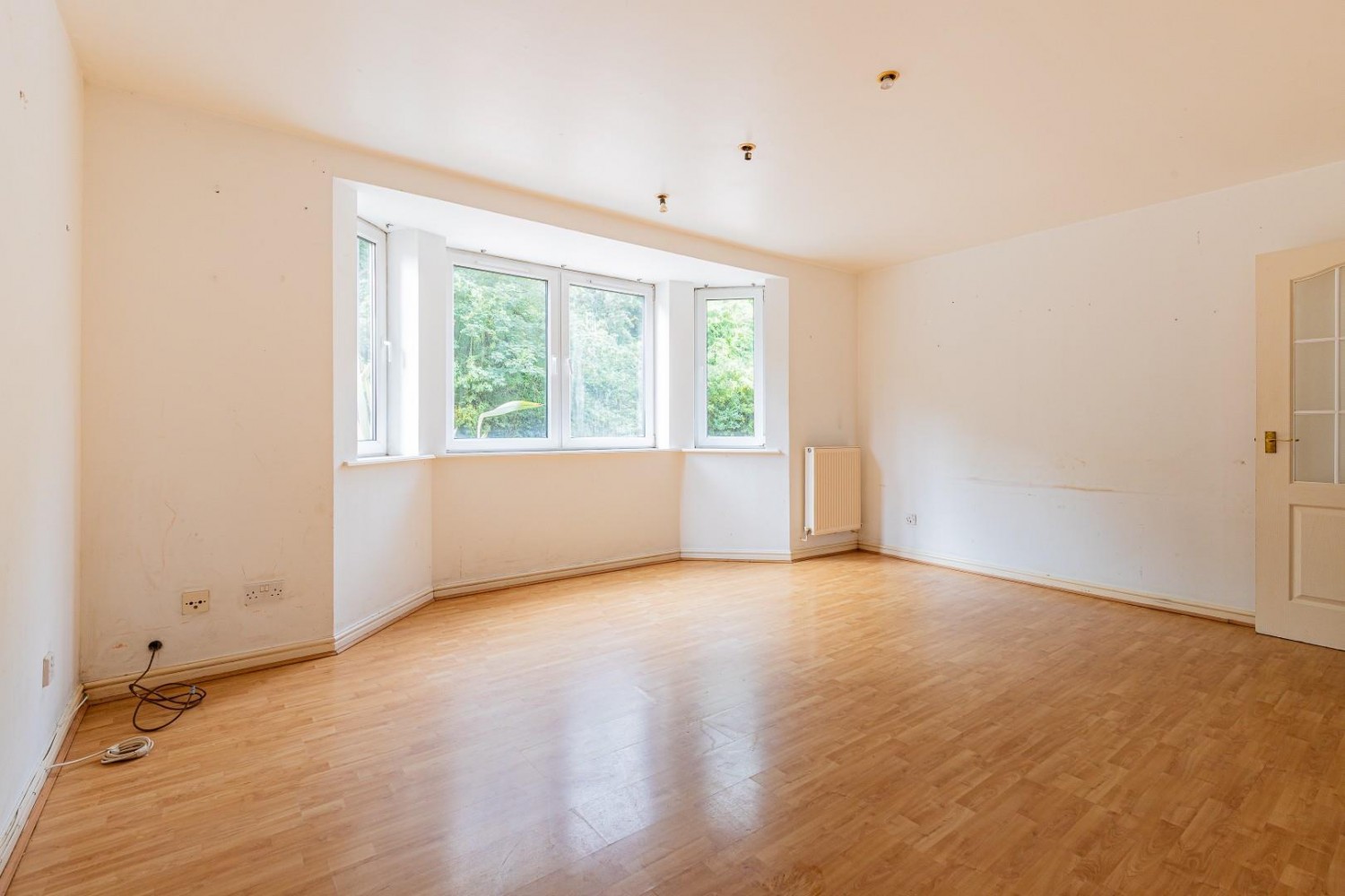Spacious living room with deep bay window to rear offering a pleasant outlook of the adjacent trees, TV point, laminate floor.