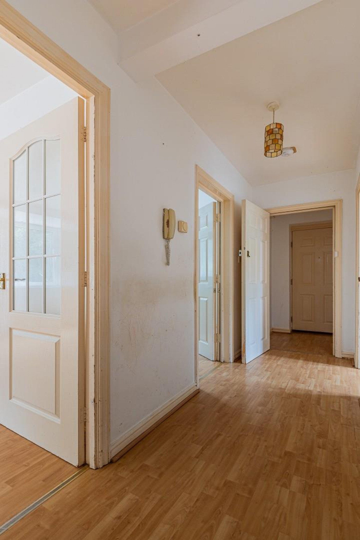 Access to all rooms, intercom entry phone, cloaks cupboard and separate linen cupboard - shelving & small radiator, laminate floor.
