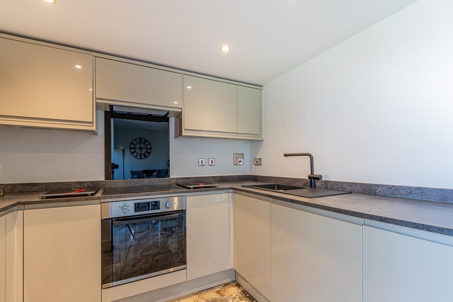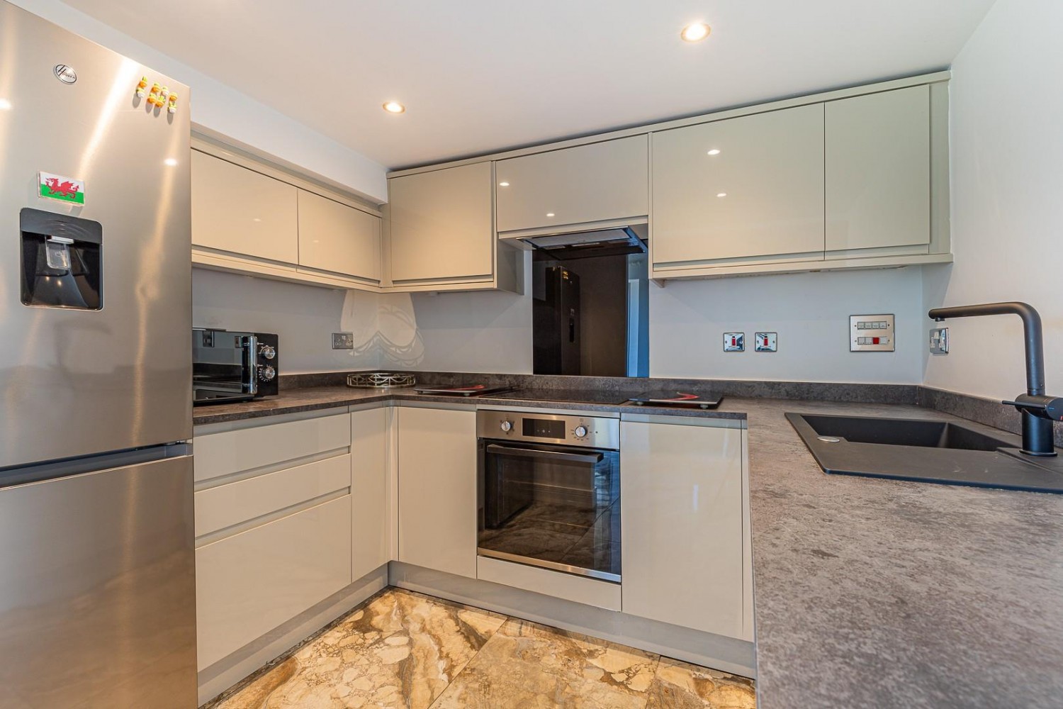 Newly fitted with an extensive range of contemporary wall and base units with laminate worktop and inset composite sink & drainer with mixer tap, integrated appliances include dishwasher, washing machine plus built in oven, hob & cooker hood, fridge/freezer to remain, porcelain tiled floor, features include LED plinth lighting and soft close doors & drawers.