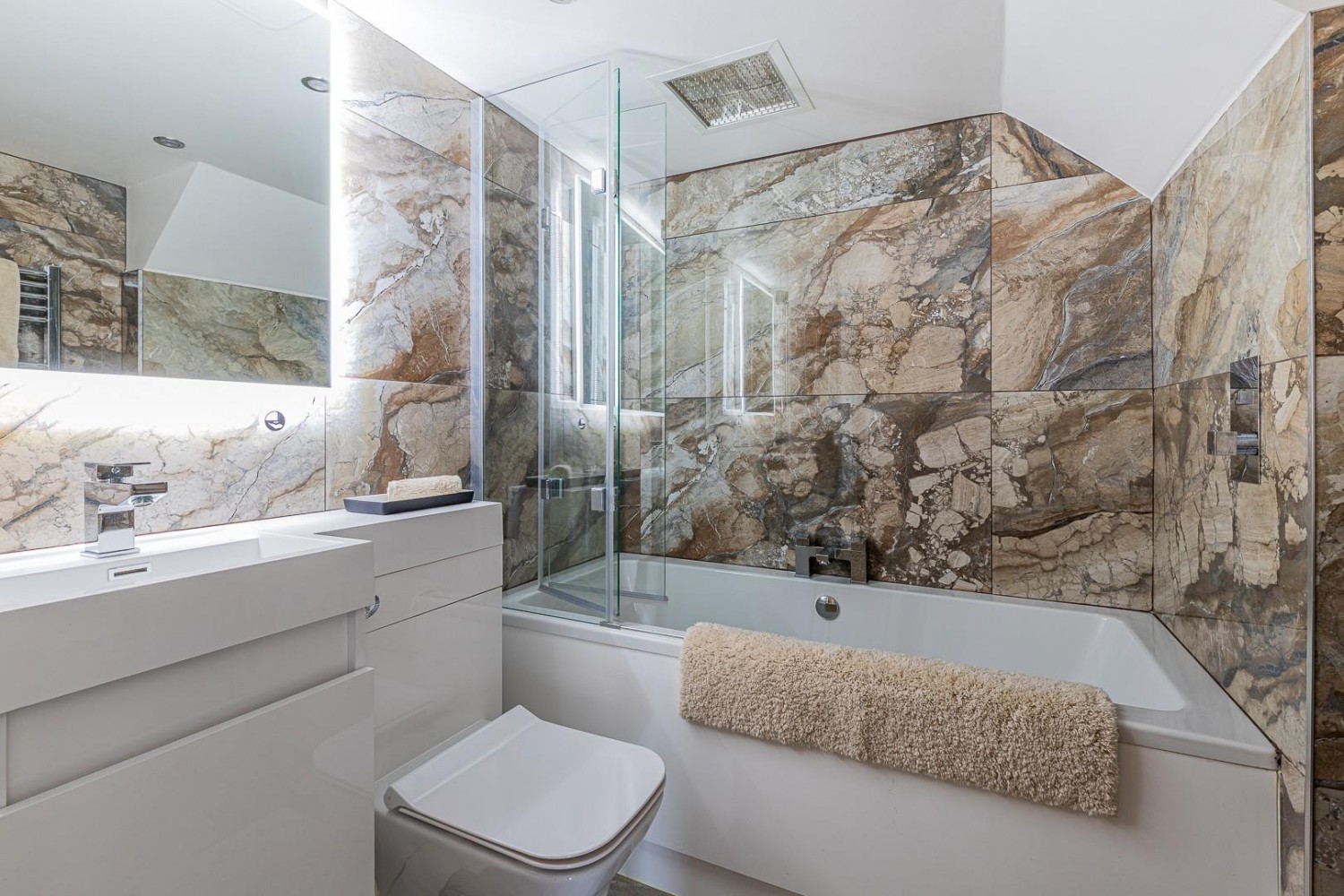 Newly fitted contemporary white suite comprising a panel double ended bath with over head shower & glass folding screen, vanity wash hand basin and close coupled wc - concealed cistern, porcelain tiling to all walls and floor, heated chrome towel rail, extractor fan, wall mounted mirror with light & Bluetooth.