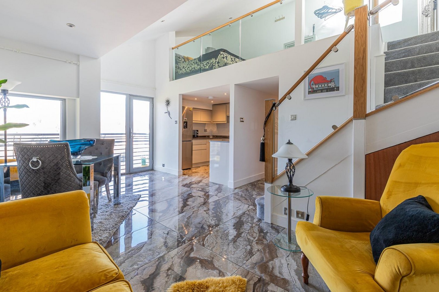 Stunning main room with curved vaulted ceiling, porcelain tiled flooring, stairs with oak & glass balustrade lead to the Mezzanine bedroom with storage cupboard beneath, open to the kitchen, to the side floor to ceiling windows and a door allowing access onto the Westerly facing decked balcony overlooking the river, TV point, telephone point.