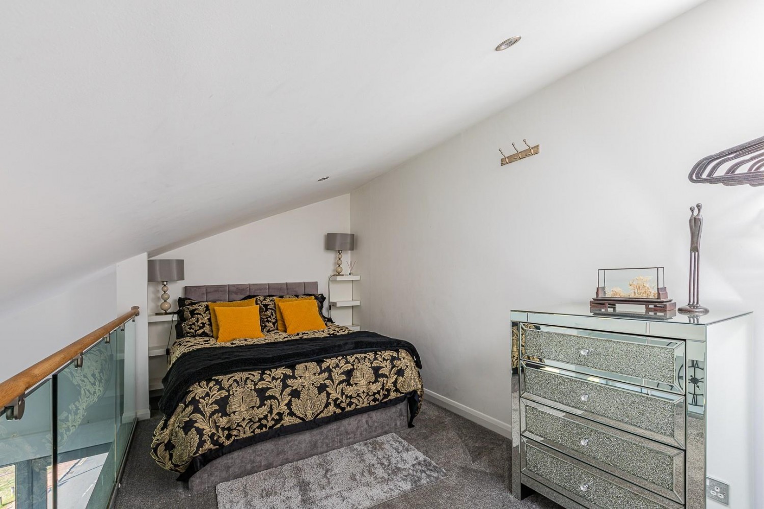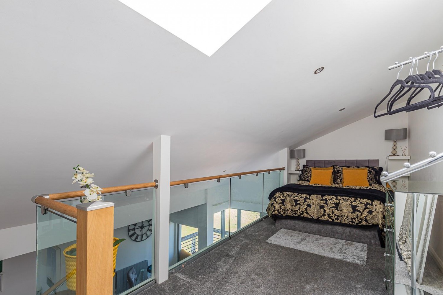Generous Mezzanine designed bedroom with oak & glass balustrade overlooking the living area, fitted carpet, curved ceiling with Velux roof window.