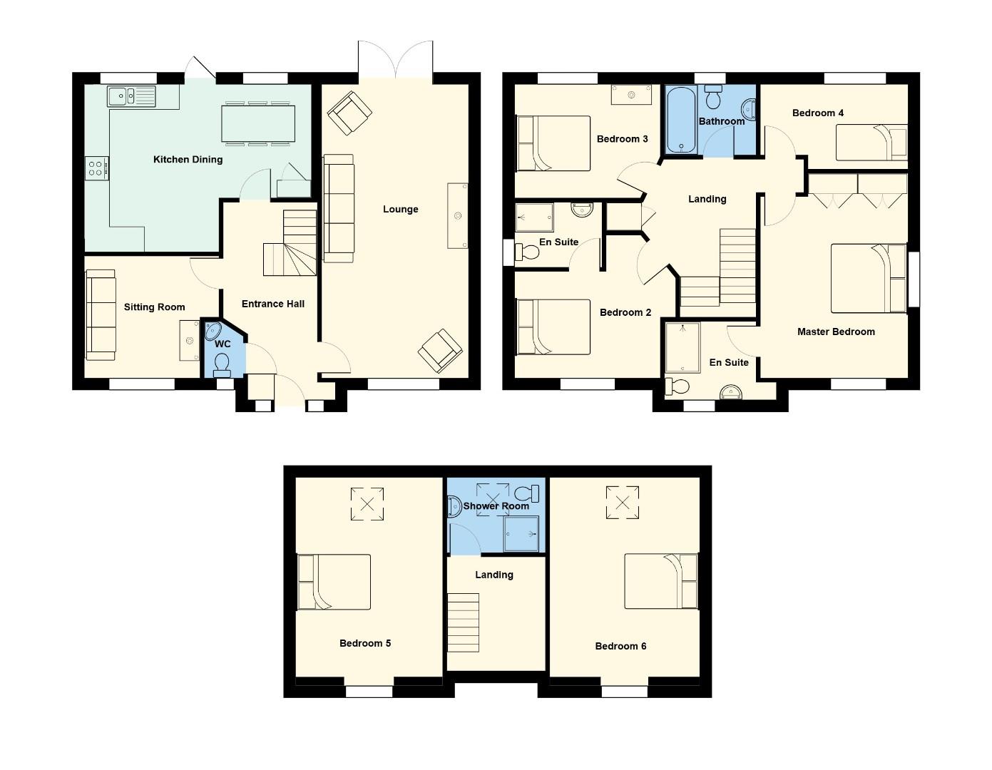 Briefly comprising a spacious and welcoming entrance hall, ground floor cloakroom, 26’ main lounge, sitting room & impressively large kitchen with dining area. To the first and second floors there are 6 bedrooms - built in wardrobes to the master plus an en suite shower room, another en suite to bedroom 2 plus there is a bathroom and shower room completing the accommodation.
