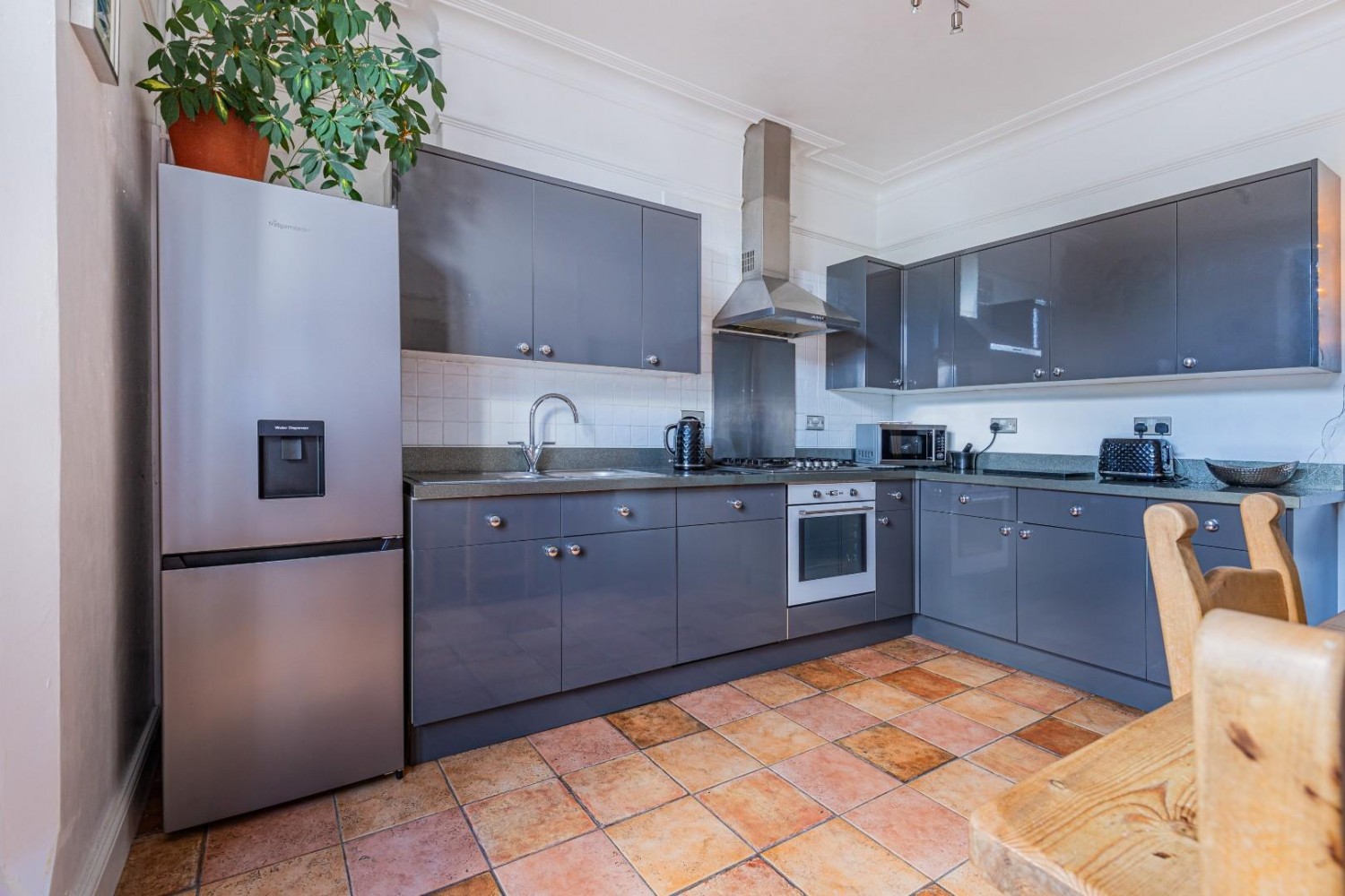 Fitted with a modern range of Hi Gloss wall and base units with laminate worktop and inset stainless steel one & half bowl sink & drainer with tiled surround, room for table & chairs, integrated dishwasher plus built in oven, 5 ring hob & cooker hood, space for fridge/freezer, tiled floor, French doors lead into the garden.