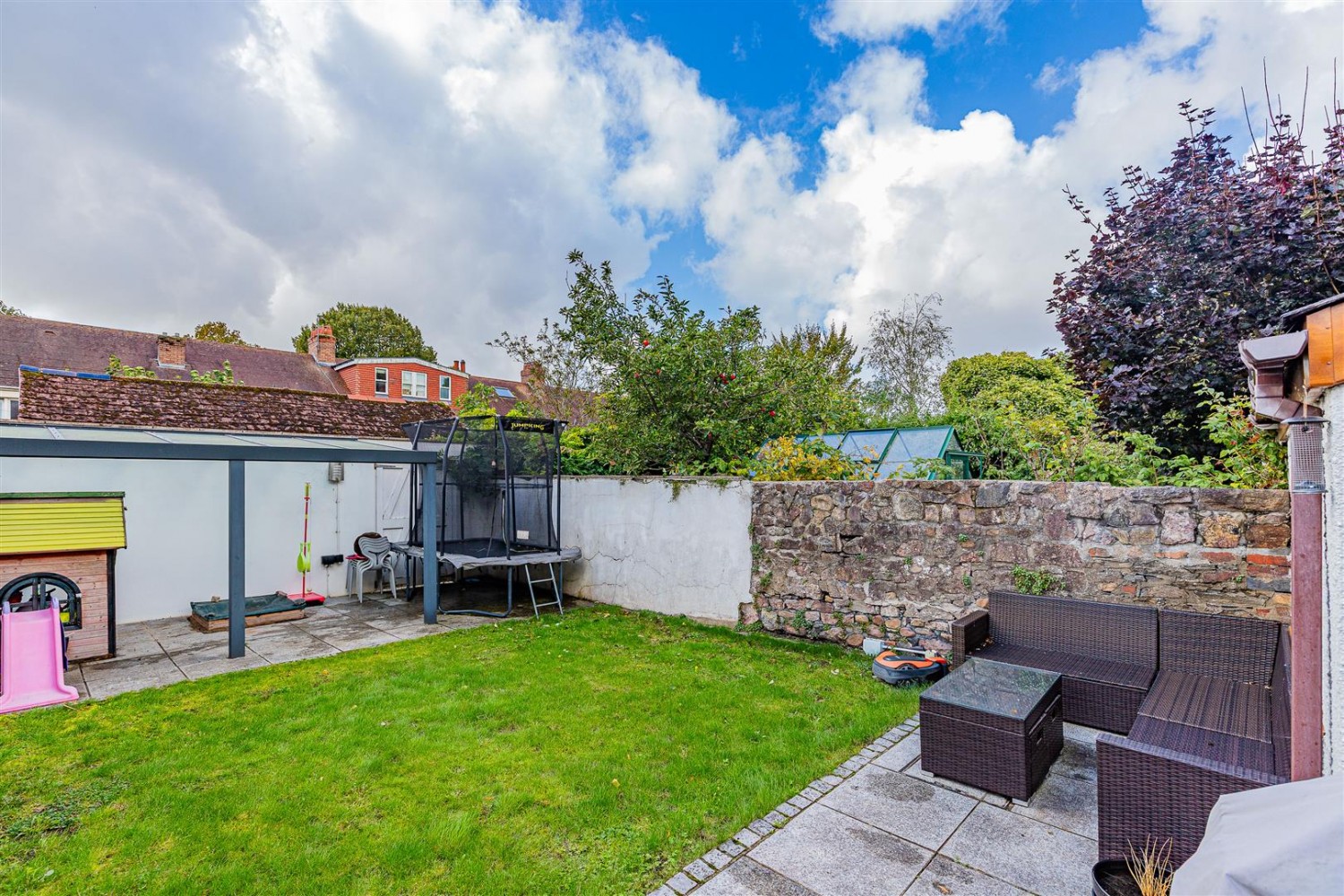 The sunny south-facing garden is designed for family enjoyment, with a raised decked area, patio, lawn, and rear lane access.