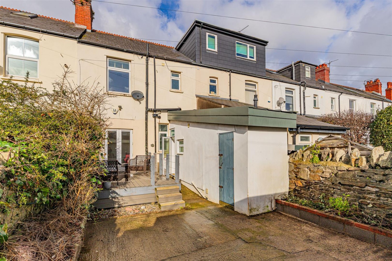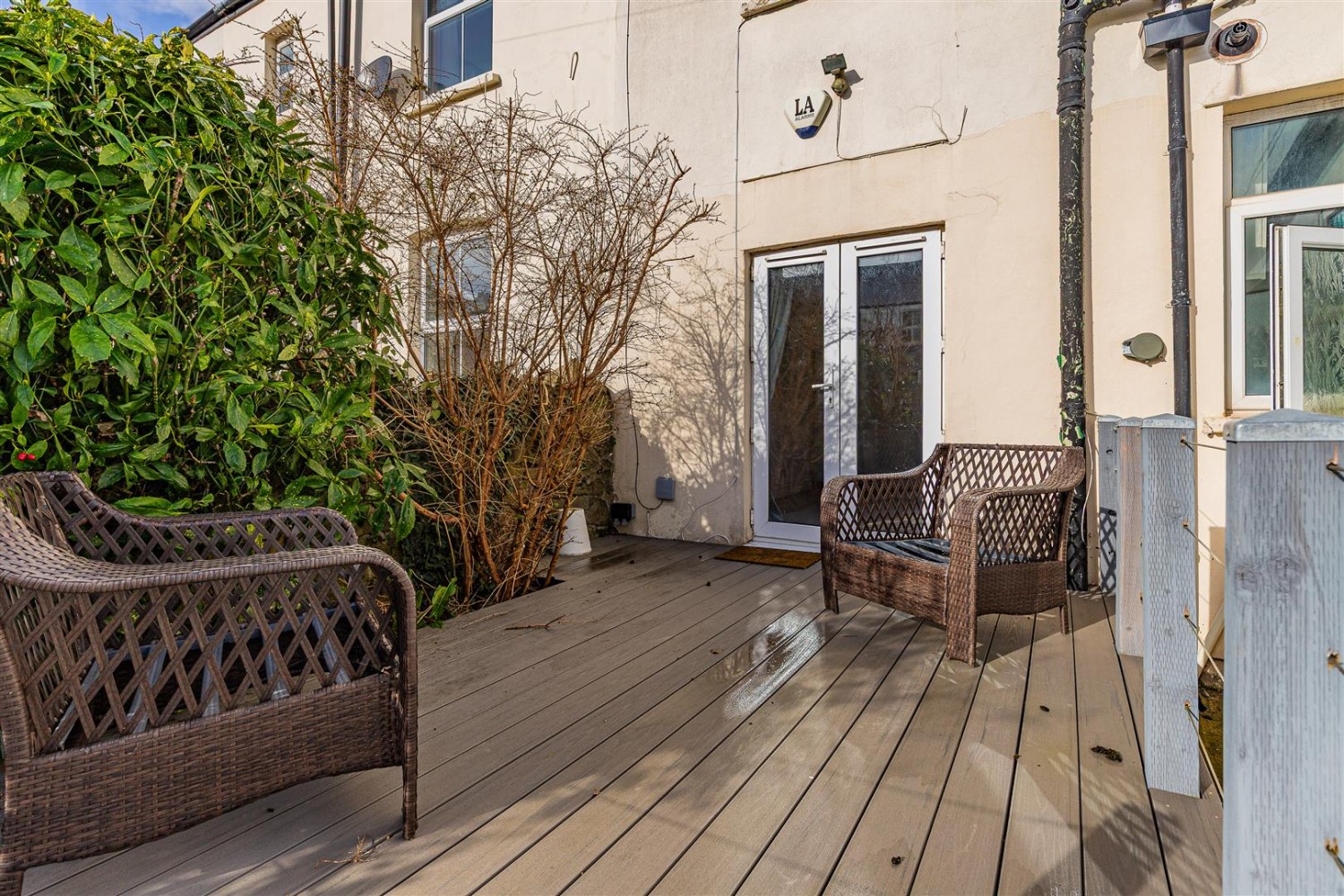 Enclosed walled rear garden with electric roller shutter for off road parking, decking area and boarder for shrubs.