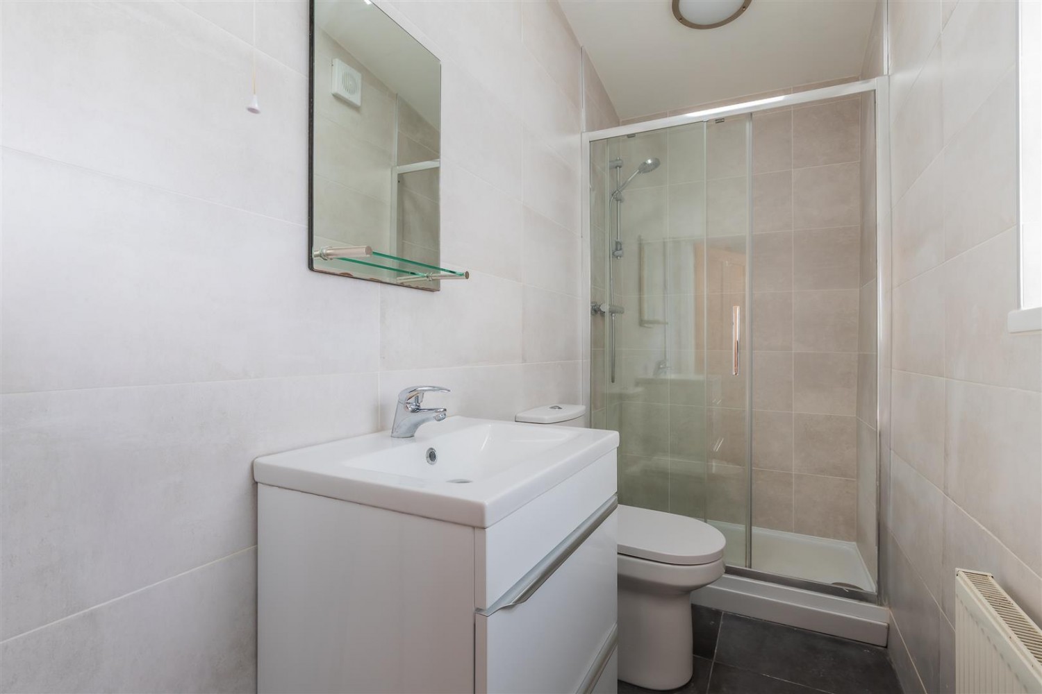 Double glazed window to rear, three piece white suite comprising electric Trition shower, low level W.C, wash hand basin, tiled walls, tiled floor, central heating radiator.