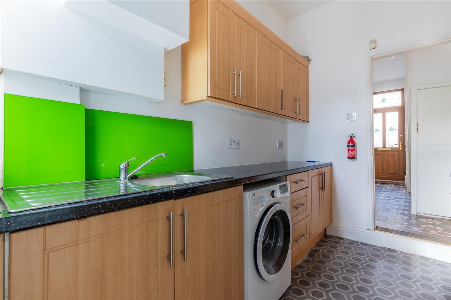 Double glazed window to rear, range of floor and wall units, four ring gas hob, built in electric oven, chrome extractor hood, space for washing machine, space for upright fridge freezer, stainless steel sink with mixer tap, central heating radiator, wall mounted combi boiler, vinyl flooring.