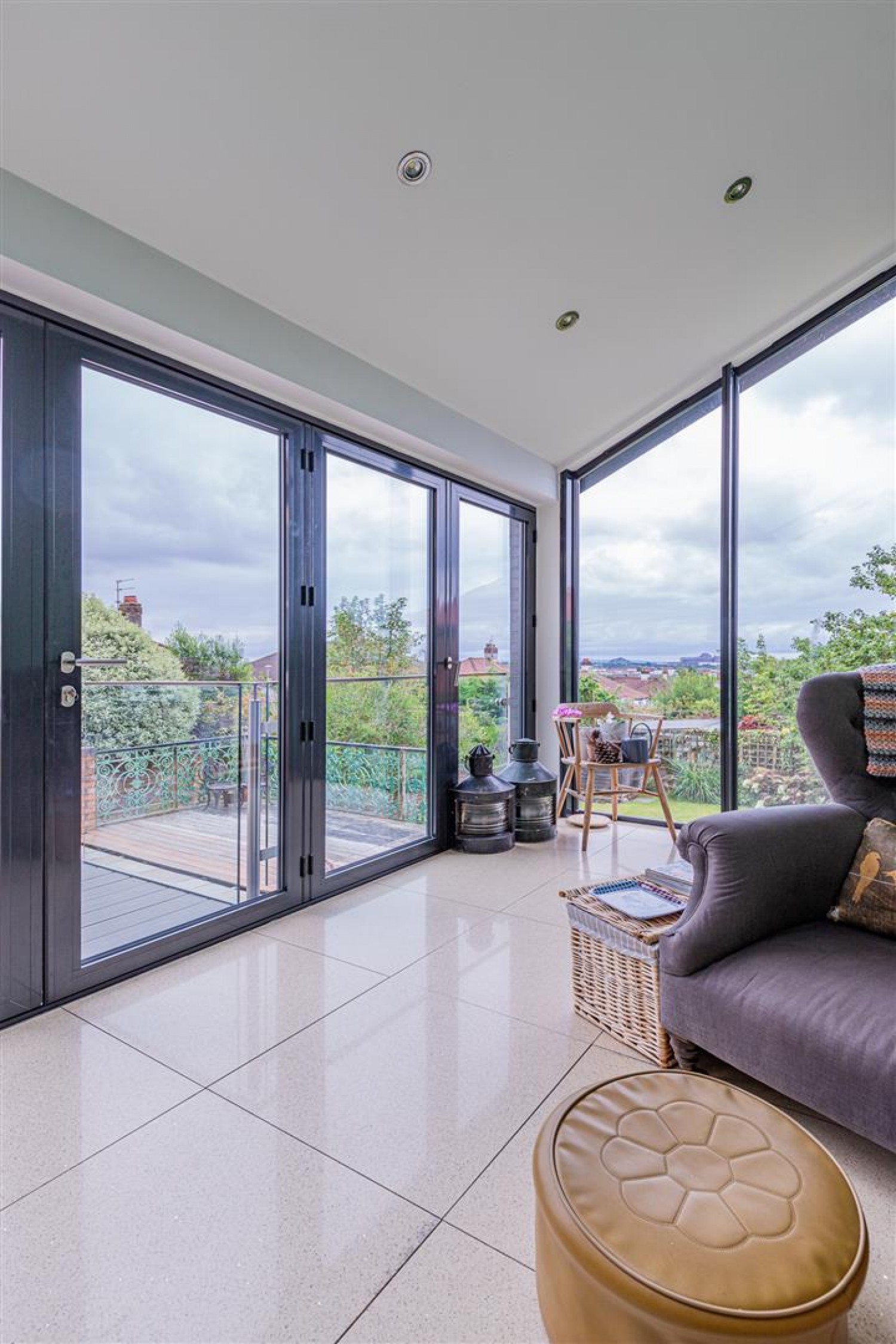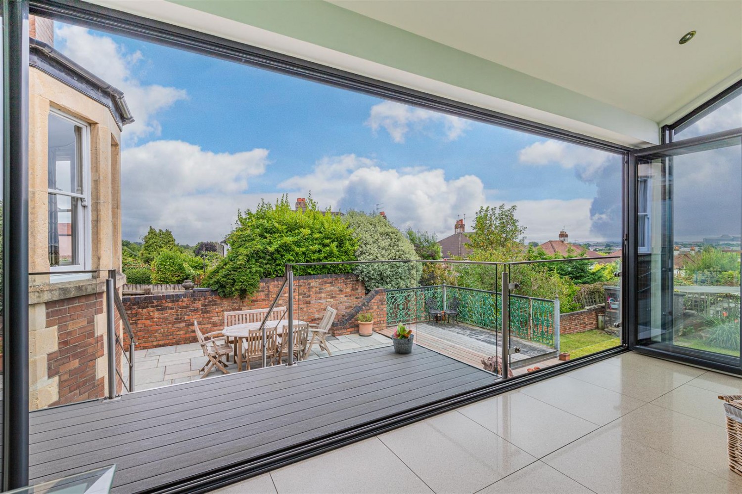 An exceptional large "L shaped" garden , decked area off the kitchen, good size patio, lawn area with mature trees and plants. The garden has a private and sunny south facing aspect.