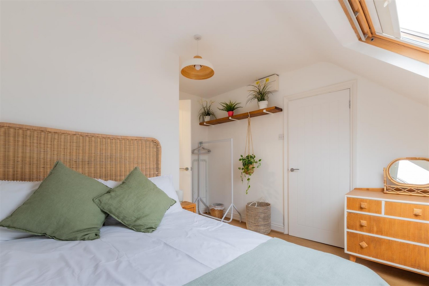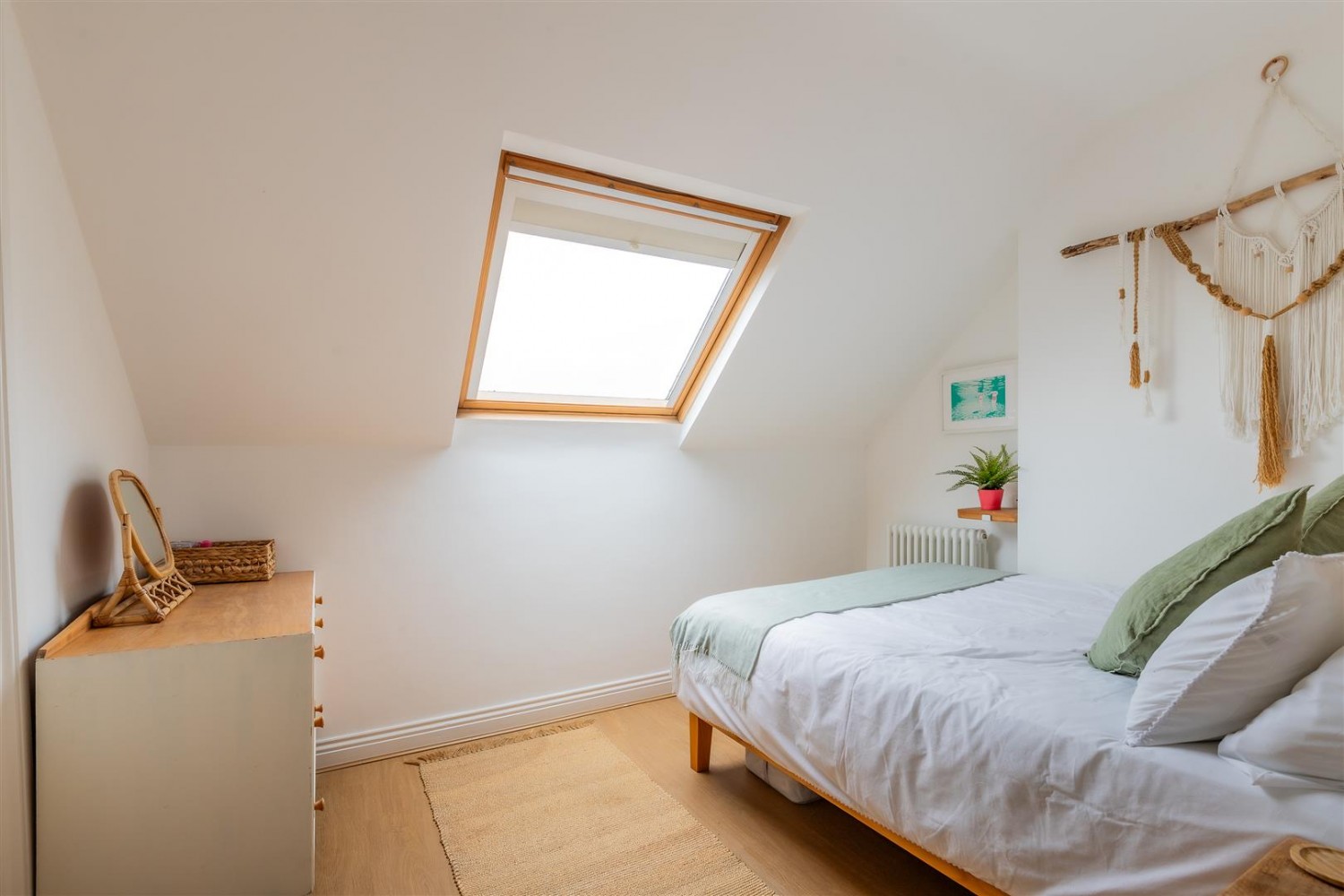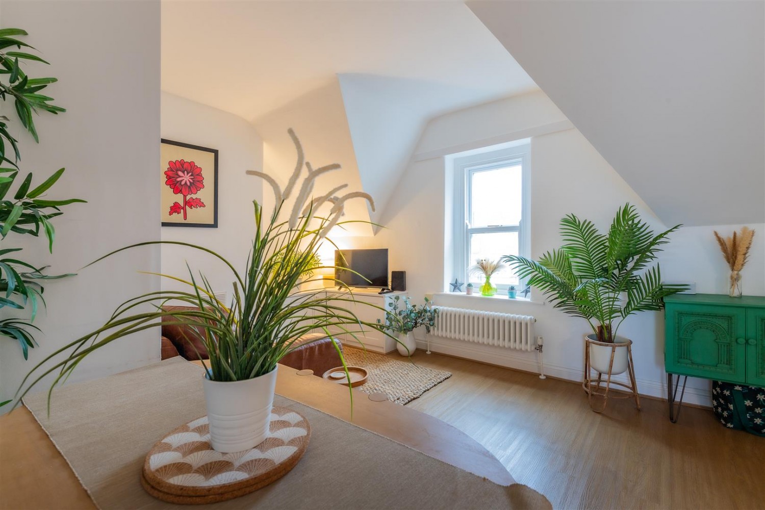 A top floor flat in a Victorian conversion with traditional brick walls and a pitched roof.
