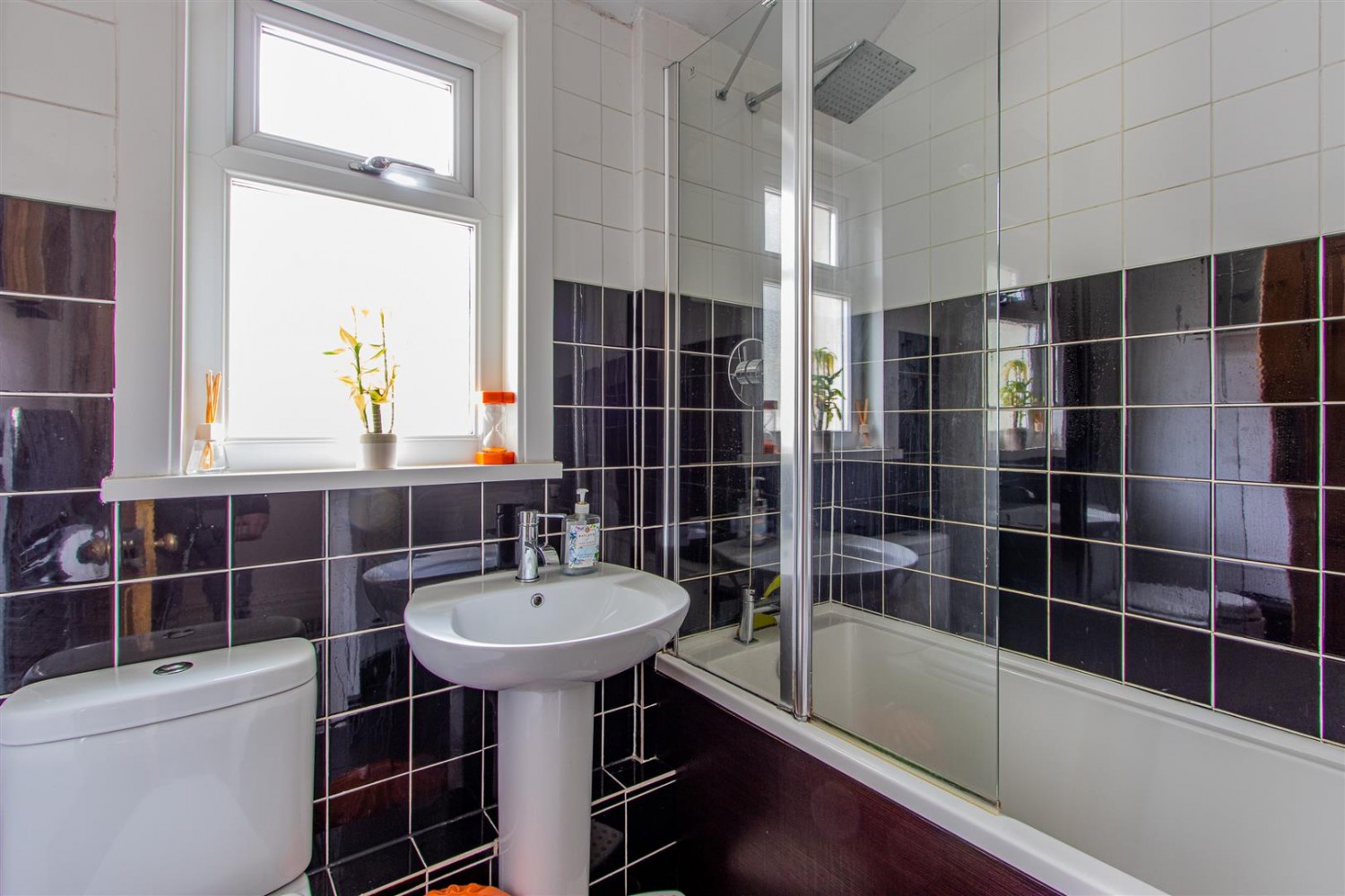 Bath with thermostatic rain shower over and glass shower screen. Pedestal basin with chrome mixer tap. Low-level WC. Fully tiled walls and floor. chrome heated towel rail. Obscured. uPVC window to side. Storage cupboard. Rear loft access.