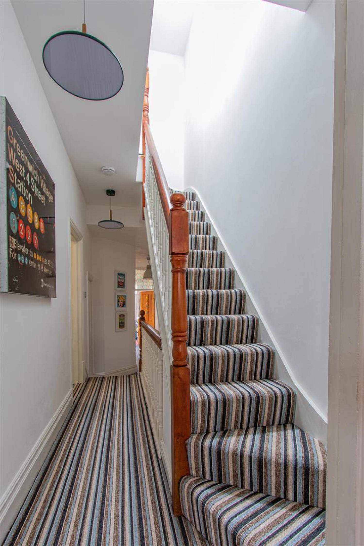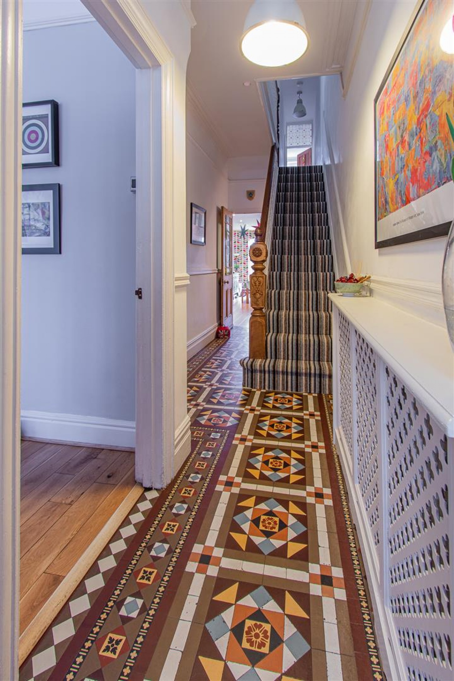 Beautiful original tiled floor, original coving, dado and picture rails. Double Radiator with radiator cover, stairs to first floor