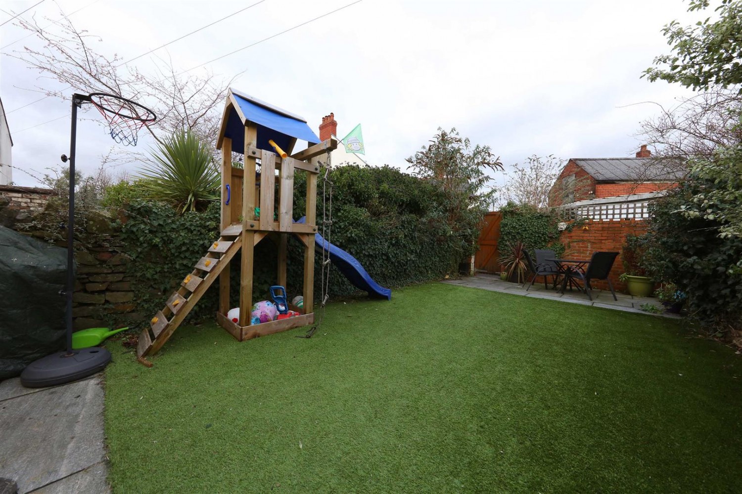 Low-maintenance East facing garden with attractive patio areas and AstroTurf lawn. A mixture of original brick and stone walls. Gate to rear lane. Garden light and outside tap.