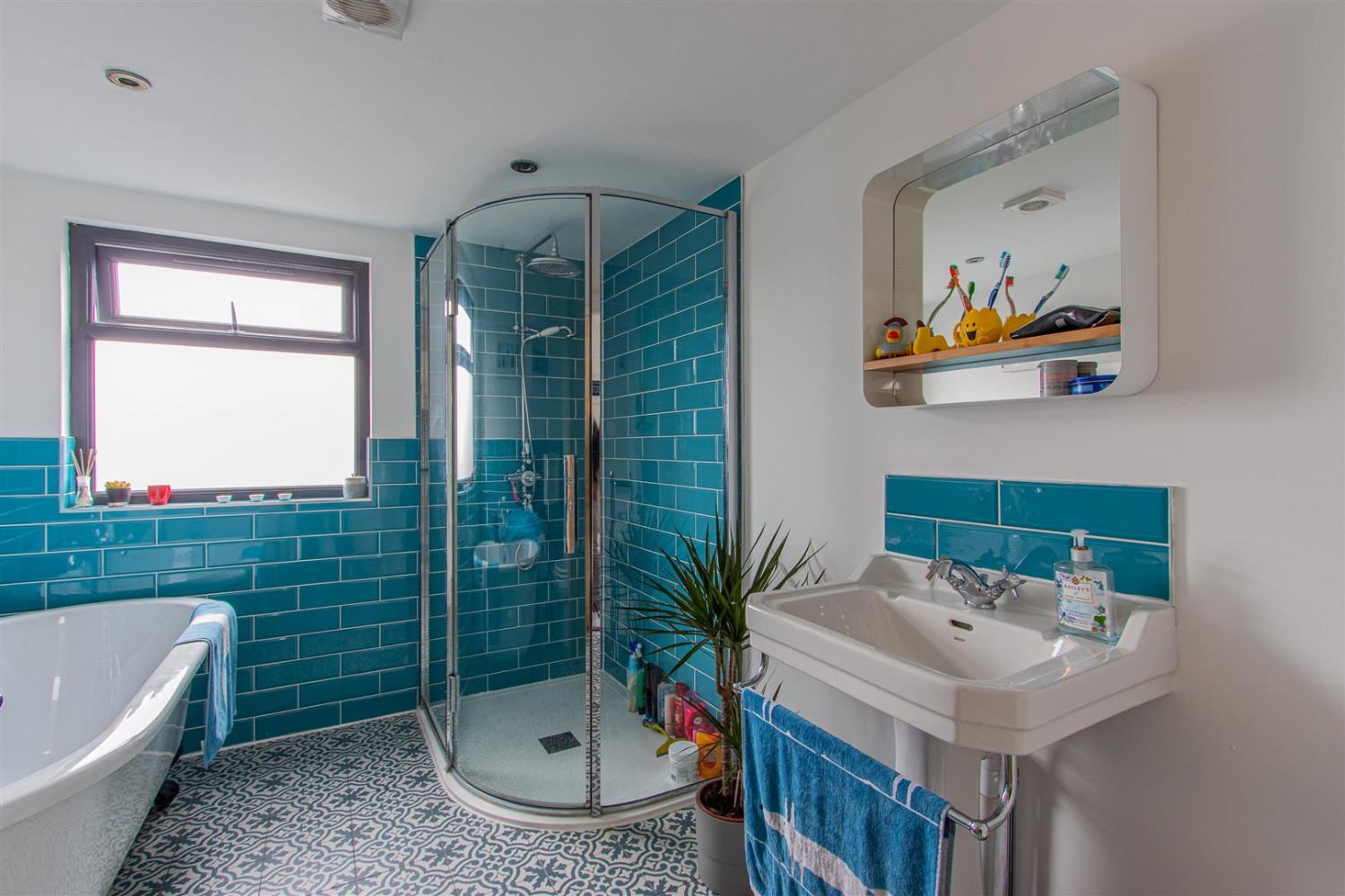 Free standing roll-top bathtub, mixer tap, low level WC, pedestal wash hand basin, walk in shower cubicle, fitted rain head shower, fully tiled floor, part tiled walls, radiator, uPVC double glazed window, extractor fan