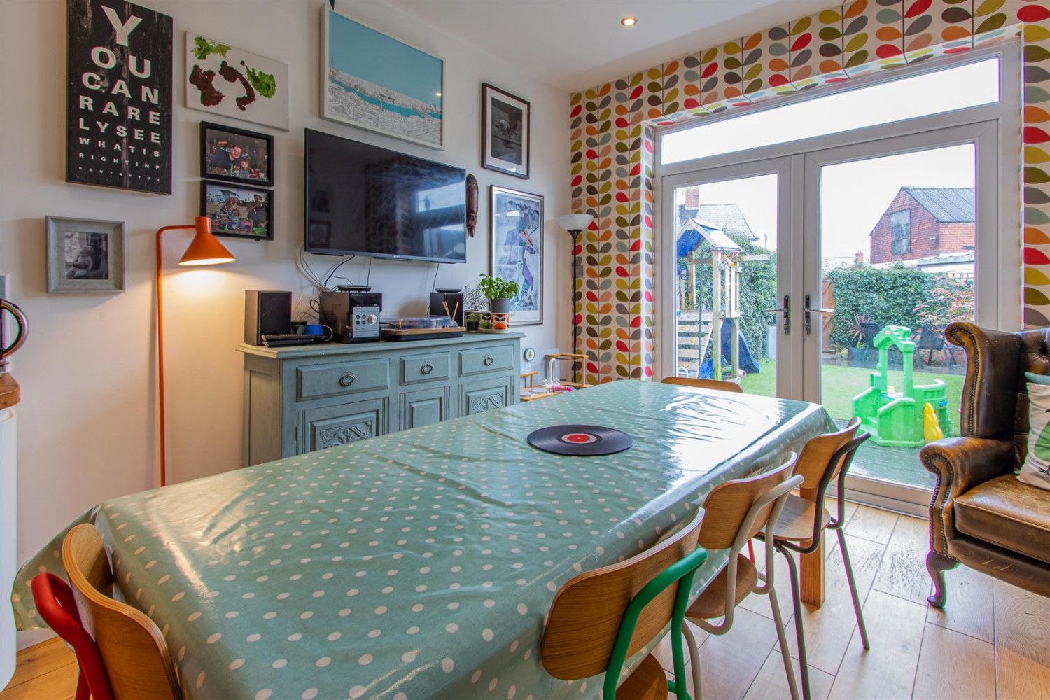 Light, Bay-fronted reception room with solid oak flooring. Original coving and picture rail, bespoke shelving and cupboard in alcoves, Attractive cast-iron wood burner with period surround. bay with uPVC double glazed sash windows, fitted shutters, Double radiator.