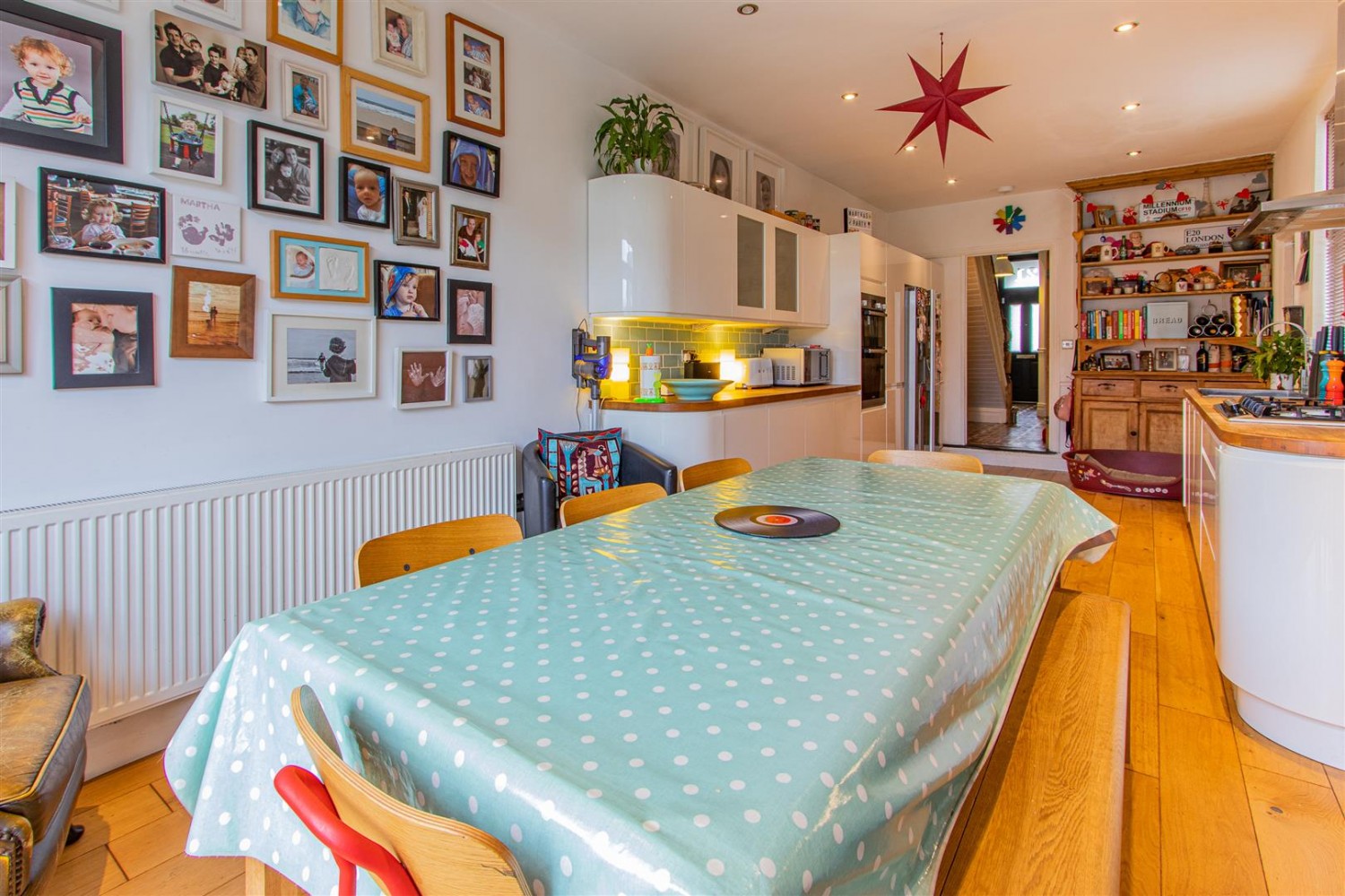 Light and spacious kitchen diner with solid oak floors and large double uPVC doors opening onto the garden. A range of white laminate floor and wall units with contrasting solid-wood worktops and brick tiled splash backs Appliances include integrated dishwasher, double fan assisted oven, 5-ring gas hob with extractor over and stainless steel 1.5 bowl sink and drainer. Space for a large American-style fridge/freezer. Large Original fitted wooden dresser and shelving. Access to utility area. uPVC window to side. Double radiator.