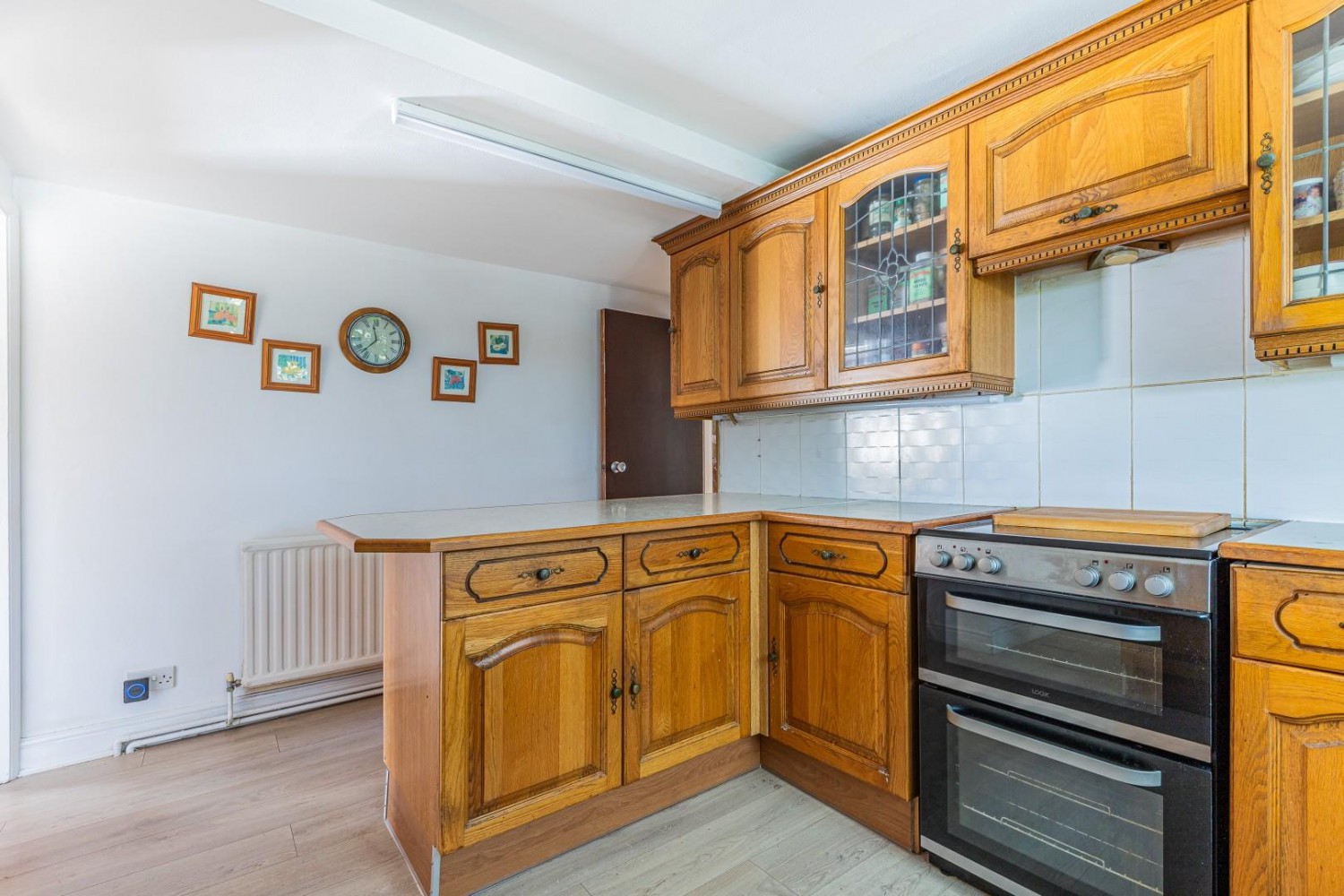 Extensively fitted oak wall and base units with round edge worktops and inset one & half bowl sink & drainer with mixer tap, window to rear, tiled surround, space for cooker and dishwasher.