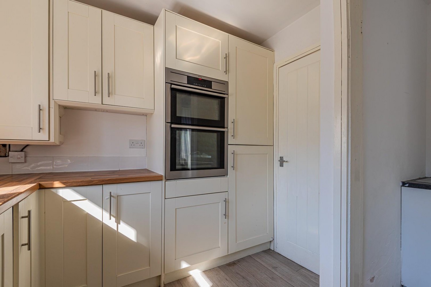 Extensively fitted range of cream wall and base units with laminate worktop and inset stainless steel sink & drainer with mixer tap and tiled splash backs, integrated fridge & freezer plus built in double oven, hob & hood, concealed gas combination boiler, window to side.
